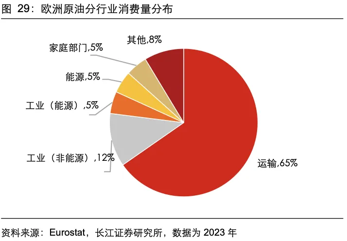 欧洲原油需求中枢回落,消费结构呈现运输业主导、工业为辅的特征。从总量与趋势来看,欧洲原油需求缓慢回落,全球卫生公共事件期间出现短期波动。从消费结构来看,运输业是欧洲原油消耗的主力,占比超过六成,工业及其他部门占比相对较小。