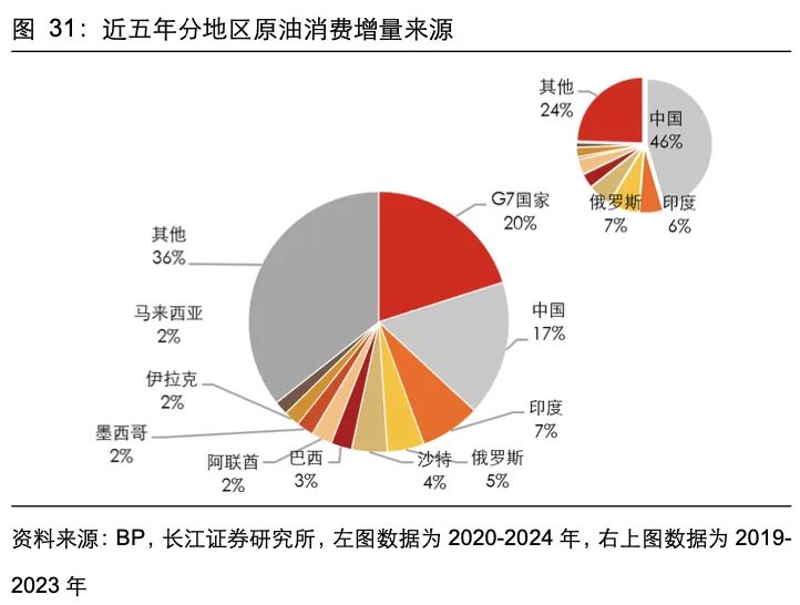 新兴市场是原油需求增量的主要贡献者。与存量消费结构不同,在增量需求上,发展中经济体占据主导地位。2023年,近五年全球原油消费增量中,发展中经济体贡献了主要部分,成为拉动需求增长的核心力量。但随着中国能源转型的迅速深化,至2024年,中国对于原油的增量需求拉动快速下降。