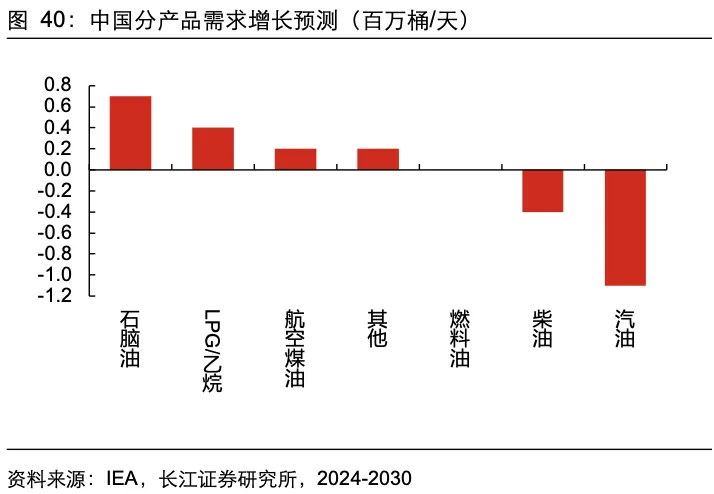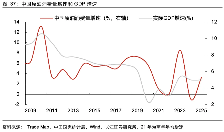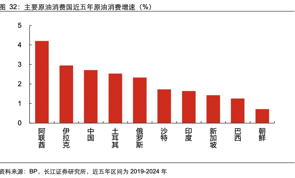 中国能源转型进程加快,原油需求下降较快。从长期视角来看,随着国内新能源产业的迅速发展与壮大,2023年后我国原油消费量增速已明显回落,不仅显著低于IEA预估的8%左右增速中枢,同样也低于过去十年4.6%的历史平均增长水平。2025年,我国原油进口再度回正,但背后并不是对于原油需求上行,而是补充了部分战略石油储备。