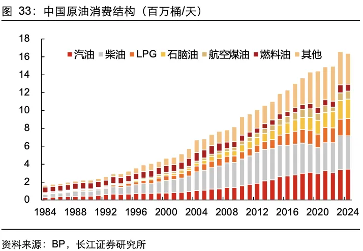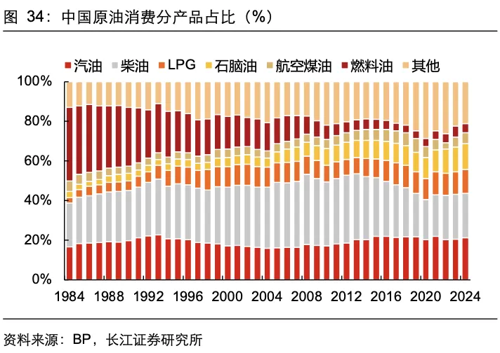 石脑油与汽油是拉动中国原油需求上升的主要动力。从消费结构看,交运用油(汽油、柴油、煤油)占比约五成。2000年以来,燃料油和柴油需求占比持续下降,而化工需求对应的石脑油与交运需求对应的汽油的占比不断提高。