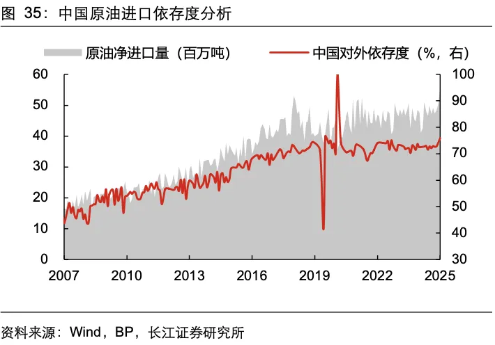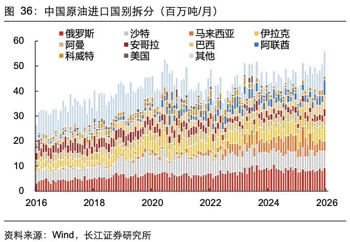 我国原油对外依存度总体保持稳定。从整体进口数据来看,我国原油对外依存度近五年稳定在73%左右,并未继续上行。在进口来源国方面,俄罗斯和中东国家仍是最主要的来源。近年来在地缘政治与全球能源供应链格局扰动的背景下,我国原油进口持续向着多元化的方向发展。