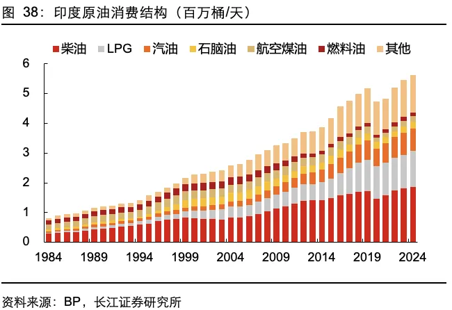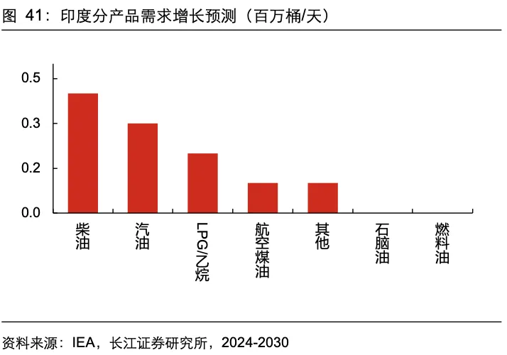 中国汽油消费将持续回落,而印度柴油需求则会迎来明显增长。以中国为代表的推进能源转型的国家,汽油需求将逐步见顶并开始收缩,不过化工用油仍会维持较快增速。以印度为代表的正处于城镇化、工业化进程中的新兴经济体,柴油需求将会出现大幅上升。