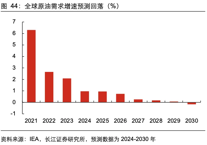 汽油消费走弱将长期拖累全球原油需求增速。根据国际能源署(IEA)发布的全球原油需求预测数据,未来几年全球原油需求增速将呈现持续回落态势,预计到2030年前后,全球原油需求增速可能由正转负,进入低速增长甚至负增长阶段。