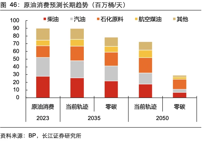全球能源转型将在长周期内推动原油需求逐步回落。按照当前原油消费趋势,公路运输领域的原油用量持续下降,汽油与柴油需求随之减少,但这一影响可能被石脑油、乙烷、液化石油气等化工原料需求的增长部分对冲。在此之后,汽油和柴油需求将进入加速下降阶段,进而拖累全球原油总消费量在本世纪中期较当前水平减少超过五分之一。