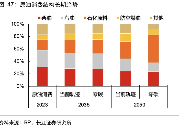 能源转型抑制交运用油需求,但化工领域的原油需求将持续增长。汽油、柴油等交运动力用油与交通运输行业发展深度绑定,随着全球能源转型不断推进,新能源汽车销量占比快速攀升,直接导致交运用油的原油需求逐步减少。