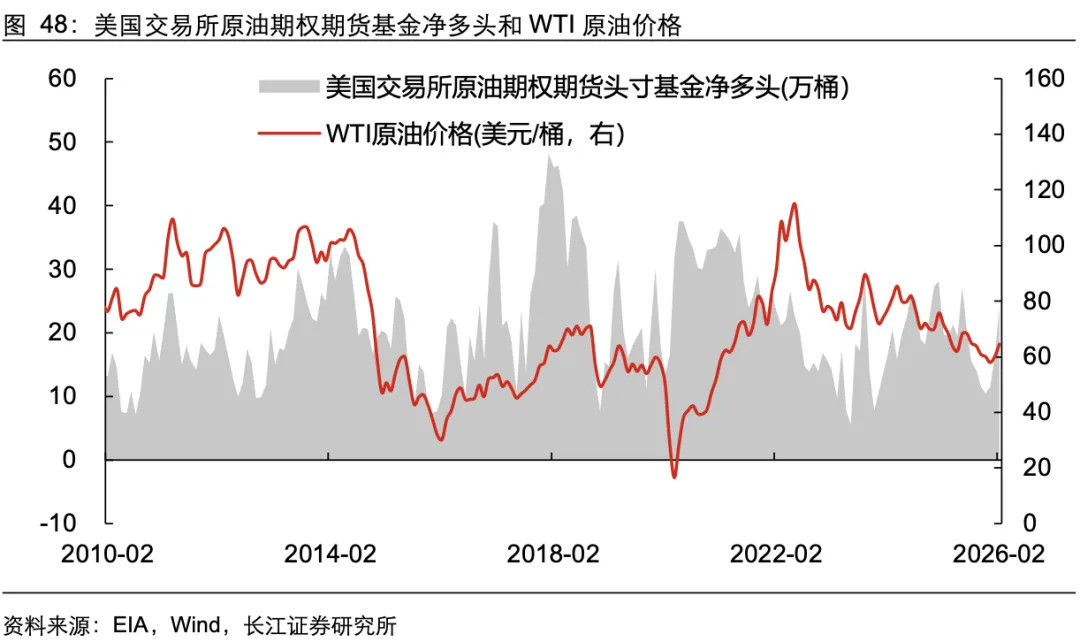 投机需求与油价呈现高度相关性。除了实体层面的原油需求外,我们可通过观察原油期货期权的净多头情况,来判断原油投机需求的变化,二者基本呈现同向变动,投机需求上行通常伴随着油价回升,反之亦然。