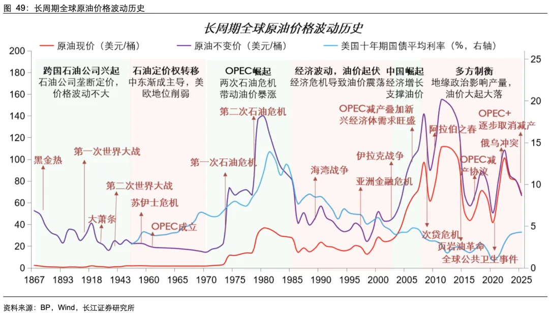 纵观历史油价波动,地缘政治影响巨大。纵观全球原油价格长周期变迁,2003年成为关键分水岭:此前油价主要由供给格局更迭驱动,定价权从跨国石油巨头逐步转移至OPEC主导,期间叠加经济危机冲击,价格呈现阶段性震荡;2003年后需求端权重显著提升,中国等新兴经济体高速增长抬升油价中枢,地缘冲突与金融事件放大短期波动。
