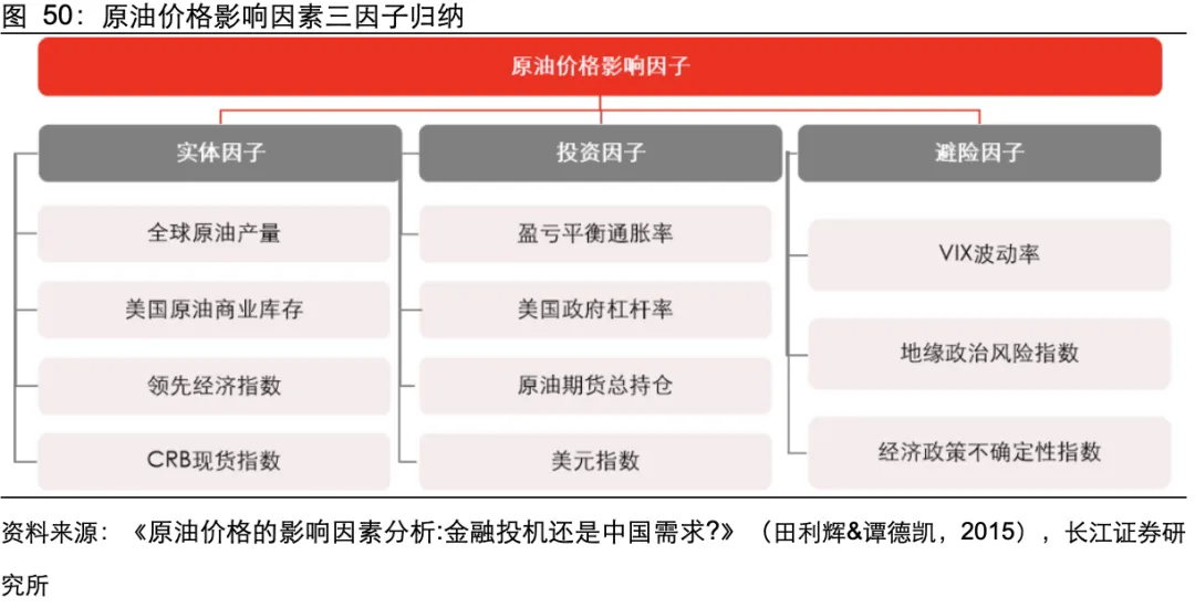 供给波动是影响原油价格的重要因素。从定价机制来看,原油作为重要的能源大宗商品,价格由供需两方共同决定,但供给端受地缘政治影响显著,主要产油国局势动荡易造成供给不稳定,相比之下需求端则更为平稳。我们结合原油的分项需求逻辑,并参考现有文献,筛选出对原油价格影响较大的指标因子,接下来将对部分影响显著的因子展开详细分析。
