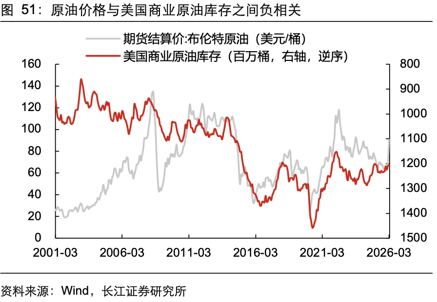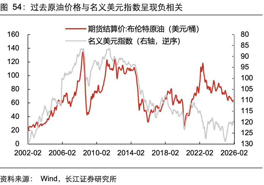 其次,投资因素同样是推动原油价格上涨的重要力量。一方面,原油价格与通胀水平高度相关,配置原油资产能够起到对冲通胀的作用;另一方面,原油主要以美元进行计价与结算,因此其价格走势与美元指数整体呈现出较为显著的负相关关系。但值得注意的是,2022年后,油价与美元指数逐步呈现正相关。