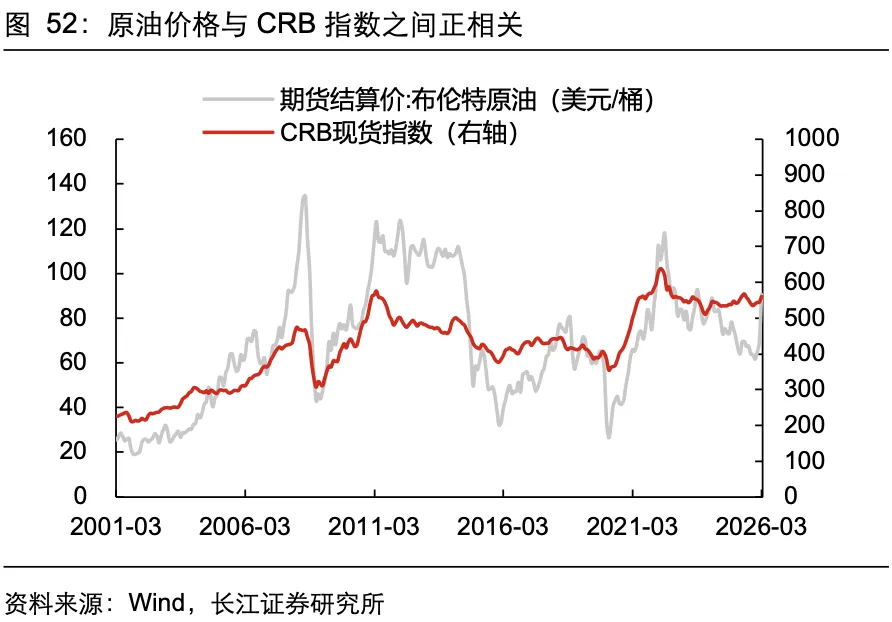 首先,原油价格在很大程度上受实体经济供需关系的影响。一方面,原油库存能够直观体现市场供需格局,其中美国原油商业库存与原油整体供需状况的关联尤为紧密;另一方面,原油具备较强的商品属性,其价格走势与CRB现货指数表现出较高的一致性。