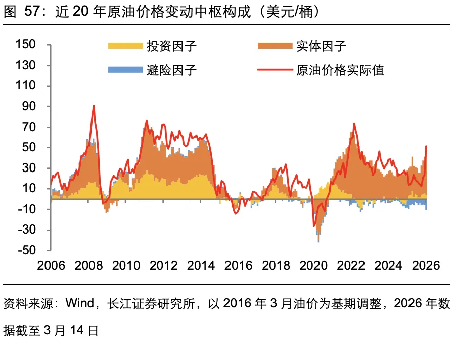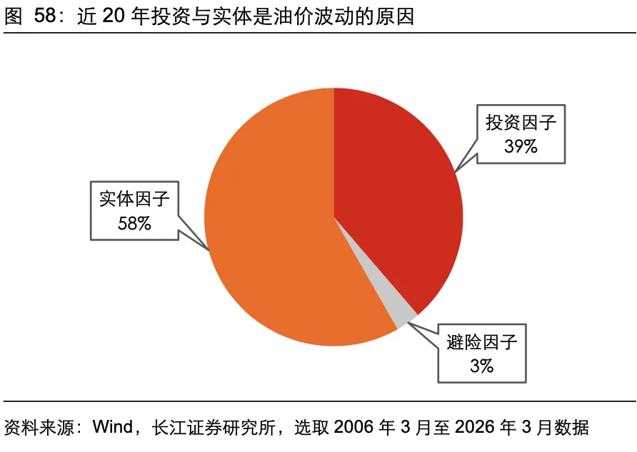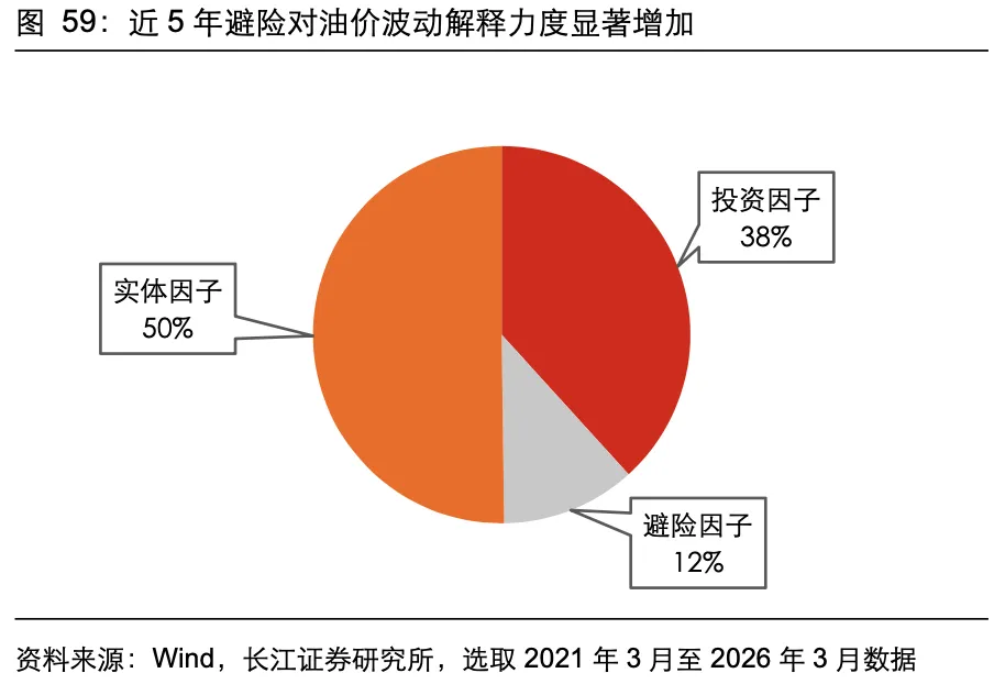 避险因素影响翻倍。从原油价格波动中各因子的解释力度来看,实体因子的变动对于原油价格波动的解释力度最大,尤其是近20年以来,其占比超五成。此外,而近5年以来,避险因子解释力度显著增加。