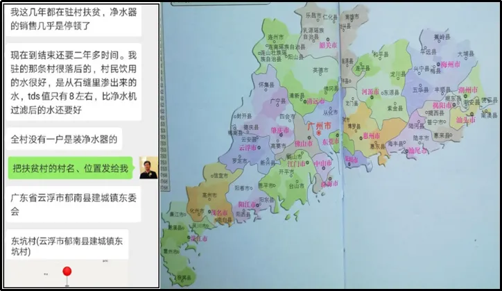 下图左是网名为“无边思忆”的网友和青岛崂泉净水器公司总经理段成同的微信,段成同转发给我的。“无边思忆”是干部,被组织派去广东省云浮市郁南县建城镇东坑村驻村扶贫。他夫人在销售崂泉净水器,所以和段很熟,常有微信往来。郁南县在广东省西部,与广西相邻。