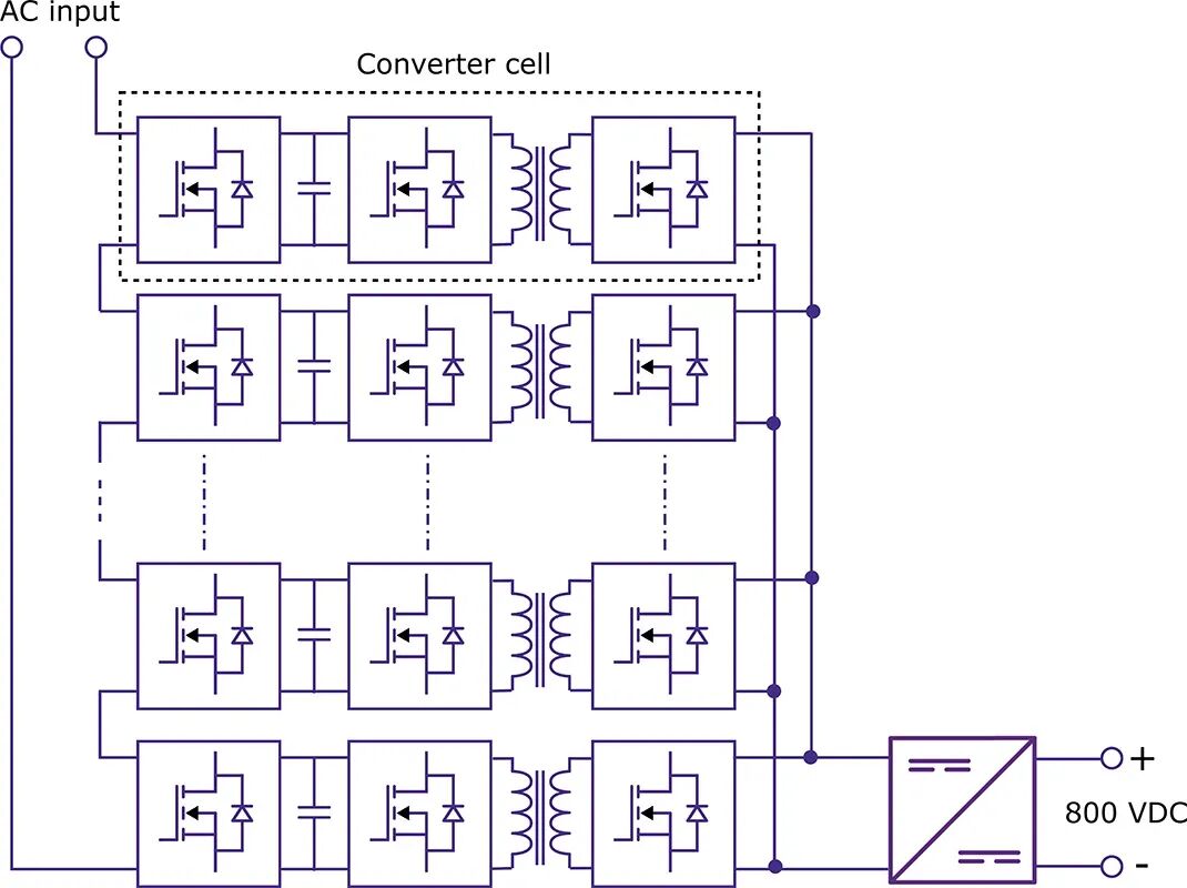 人工智能 (AI) 数据中心的电源输入通常连接到 13.8 - 35 kV 交流电等级。固态变压器 (SST) 将高电压交流输入转换为连接到计算机架的 800 V 直流输出。图 3 展示了一个典型固态变压器 (SST) 架构的简化构建模块,该模块由多个基于单元直流母线和功率器件电压等级的级联转换器单元组成。