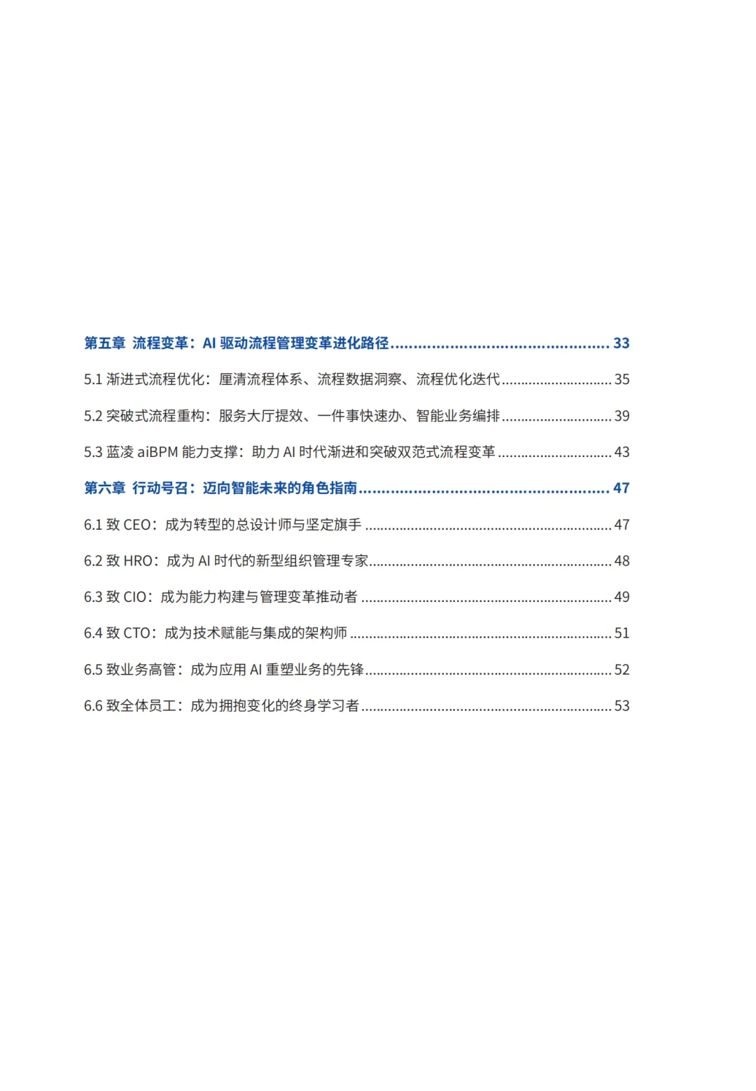 报告提出破解转型困局需通过场景 + 流程双维变革,场景变革聚焦关键岗位打造数智化工作空间,通过三步推导、产品三件套、实施三部曲实现落地;流程变革则分渐进式优化与突破式重构两类,依托蓝凌 aiBPM 平台实现从流程自动化到业务智能化的过渡。同时,转型需重塑组织角色,CEO 为总设计师、HRO 构建混合人才体系、CIO 搭建能力中台,全体员工则要成为人机协作者与终身学习者,形成全组织协同的转型格局。