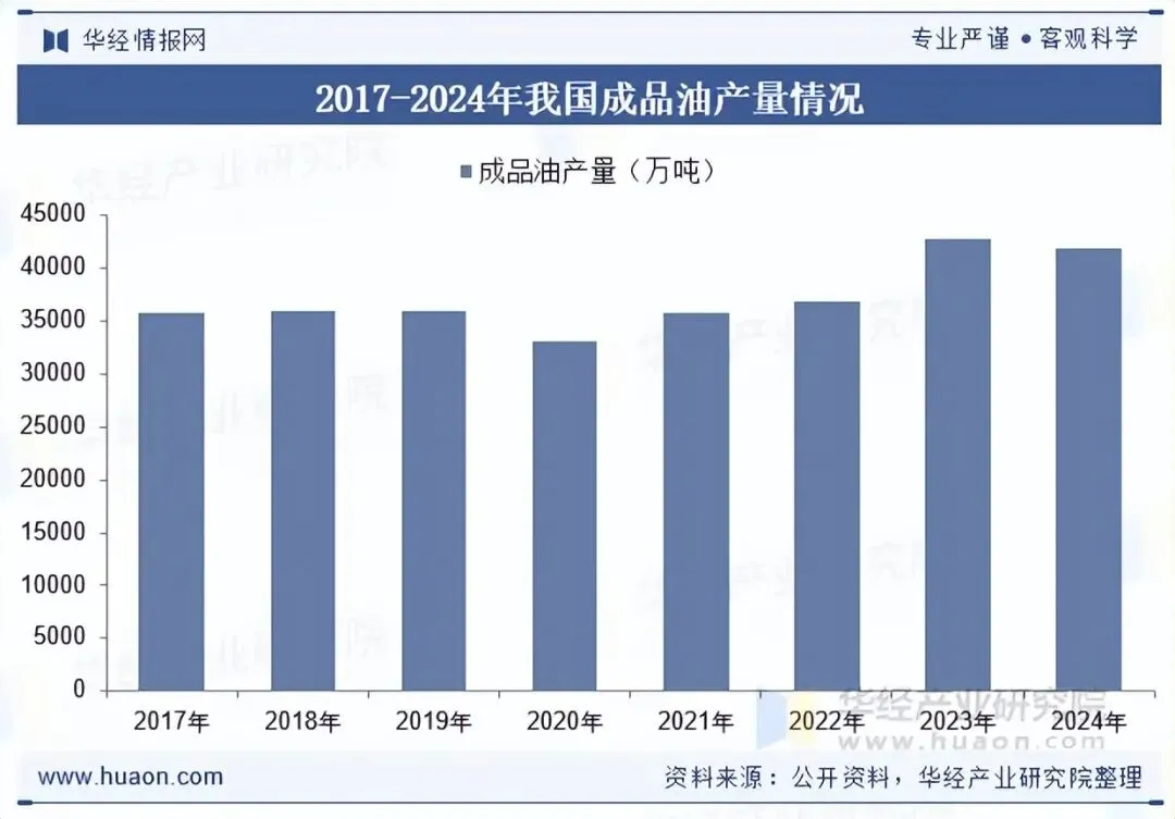 成品油主要用于汽车、摩托车、工业机械、航空等领域,作为发动机的燃料,其市场需求受到汽车产业、城市交通系统、高速公路收费政策、固定资产投资、物流行业发展、宏观经济等方面的影响。2024年国内成品油的产量是4.2亿吨,同比下降了2.3%,主要由于新能源对传统燃油市场的冲击以及出口利润的萎缩,汽柴油产量下降严重,导致成品油产量的整体下降。