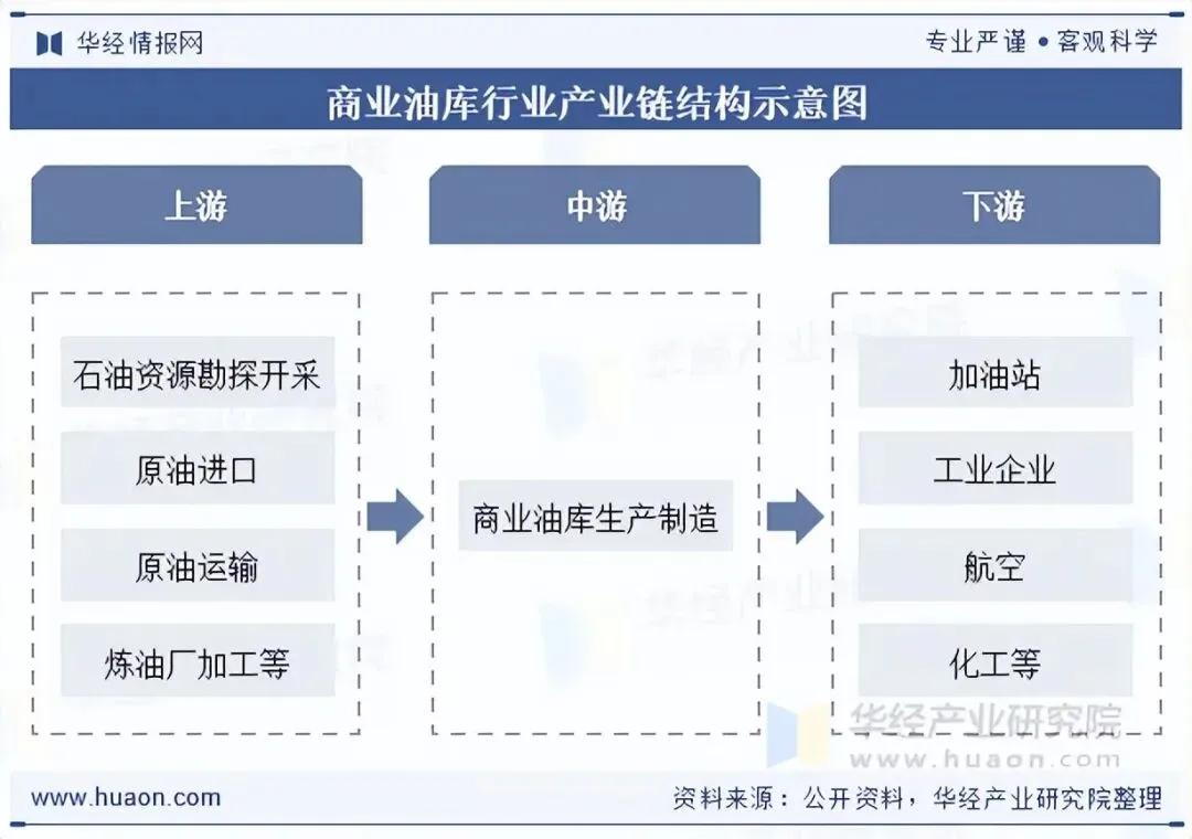 商业油库产业链以石油资源勘探开采为起点,涵盖原油进口、运输及炼油厂加工环节,形成上游供应基础。中游以商业油库为核心,通过储油罐、输油管道、装卸码头等设施实现油品储存、中转与分配,支撑成品油(如汽油、柴油)、化工原料及燃料油的多式联运配送。下游连接终端用户,包括加油站、工业企业、航空、农业、化工企业及发电厂等,满足能源消费需求。