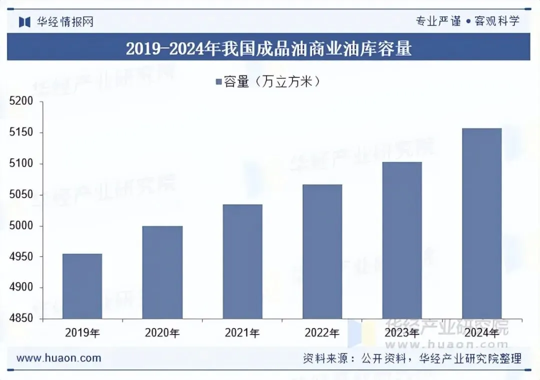 近年来,国内成品油库库容保持快速增长态势。我国成品油库建设项目在不断推进,中外合资企业等新进入这一市场的企业在不断新建、收购成品油库,扩容态势迅猛。2019年我国成品油商业油库容量4955万立方米,到2024年成品油商业油库容量达到了5158万立方米。
