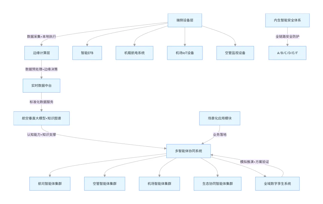 机载边缘节点:在飞机航电系统、智能 EFB 中部署轻量化智能体与模型,支持无网络环境下的本地航迹优化、风险预警、应急决策,决策延迟≤100ms;