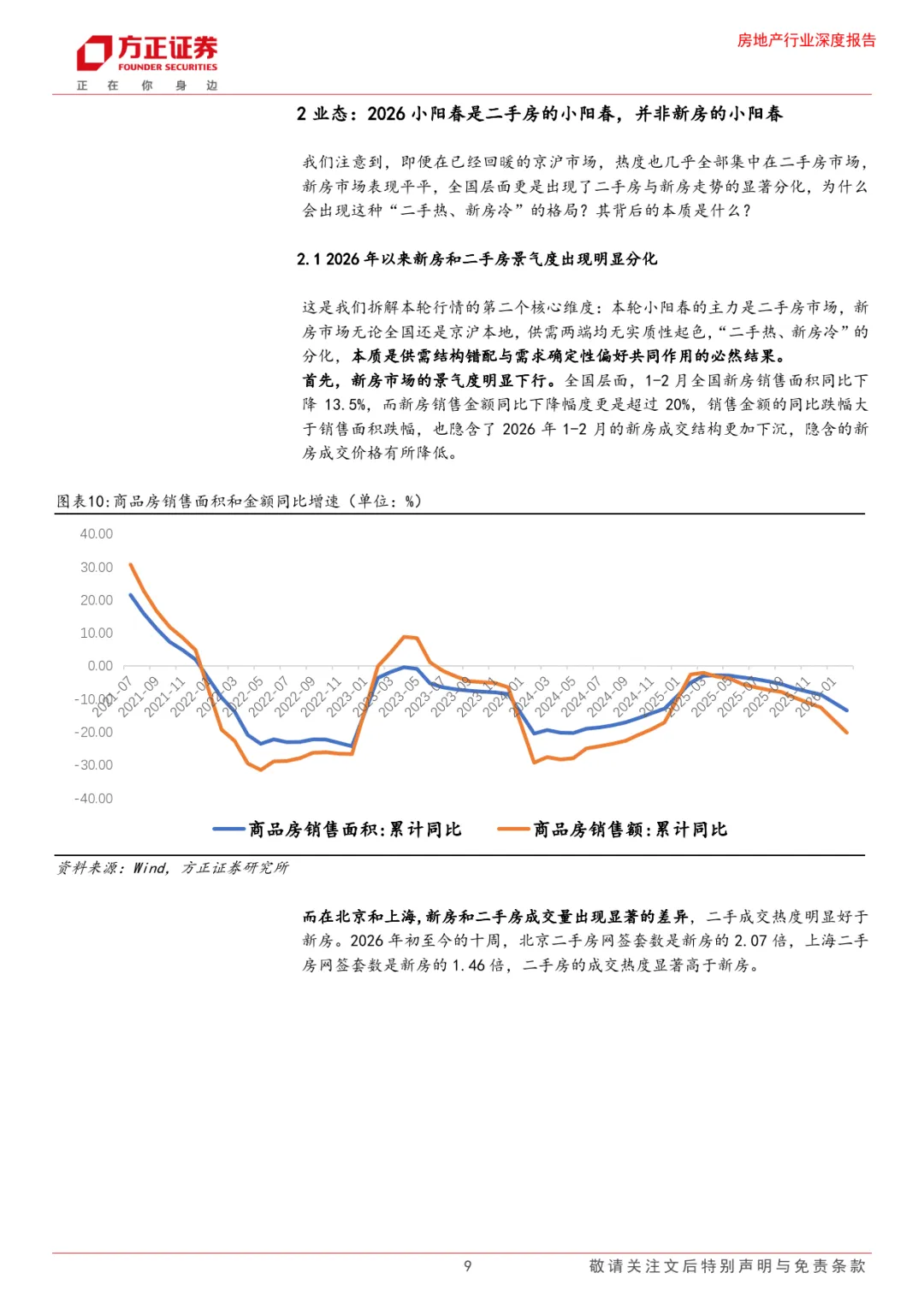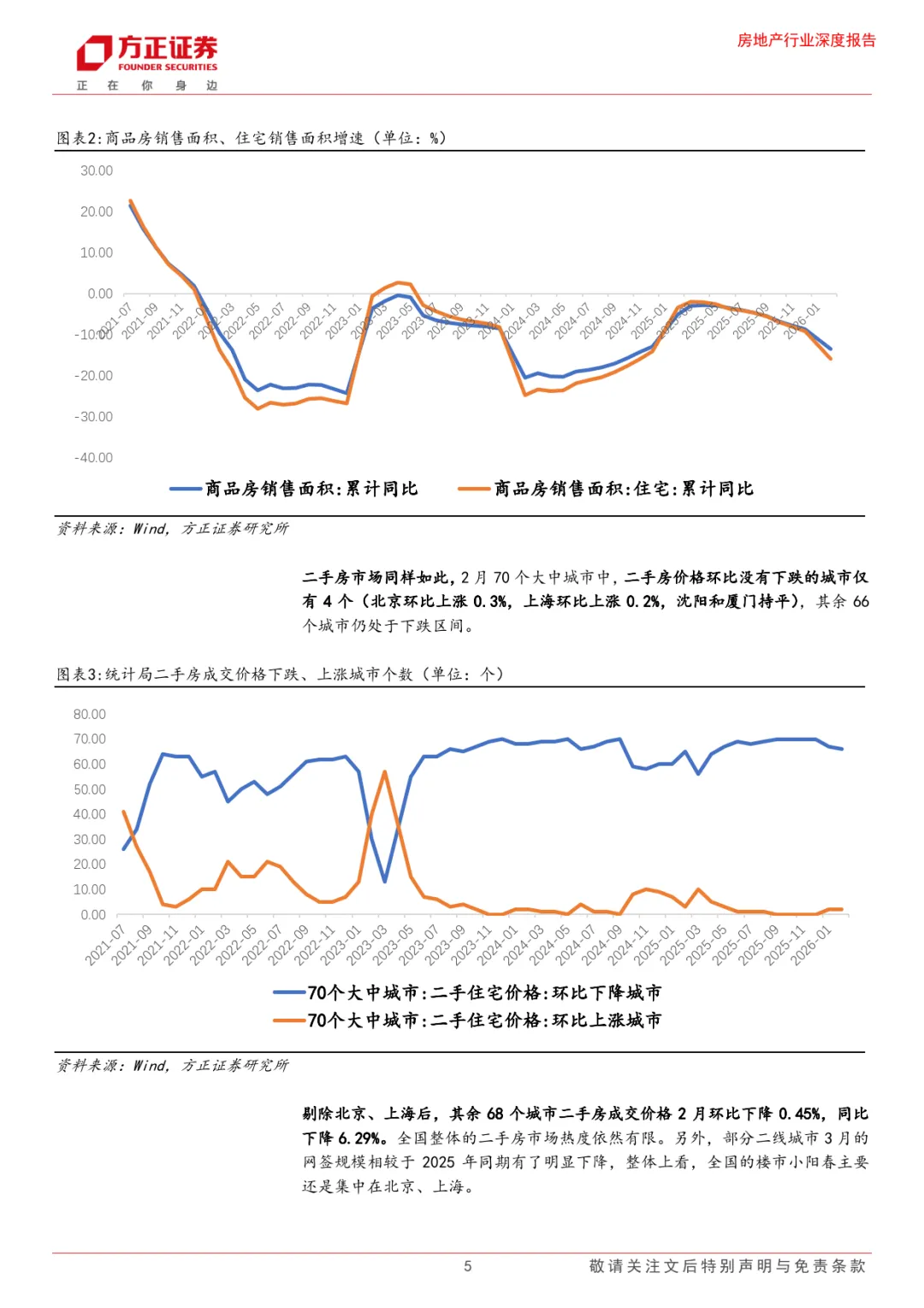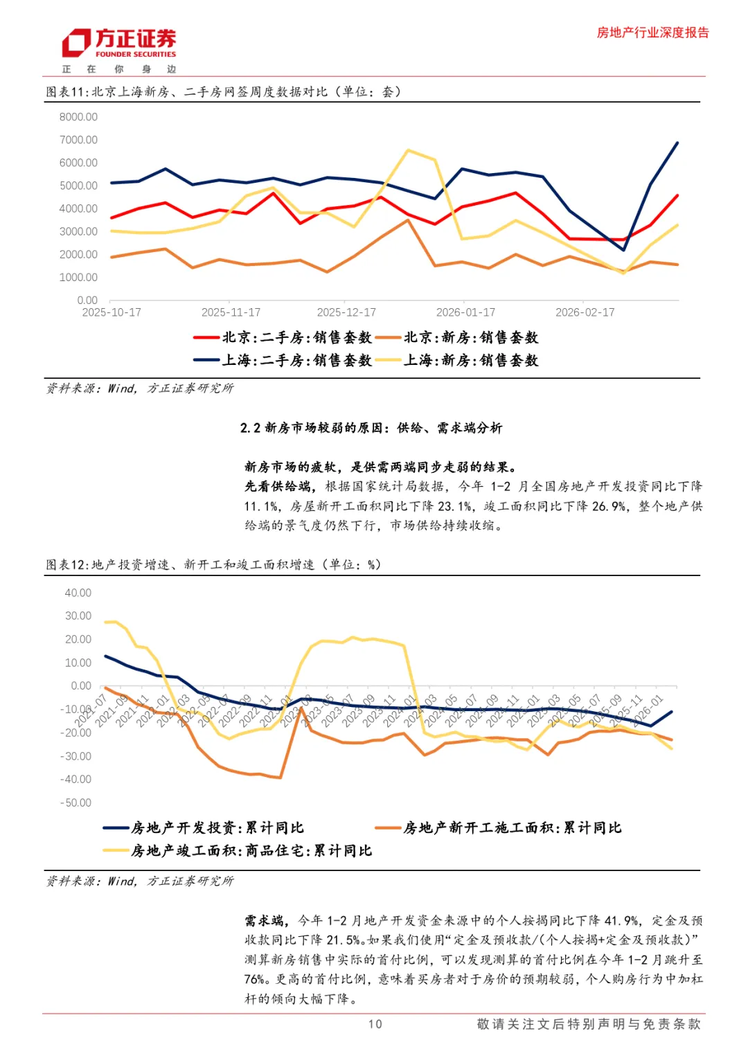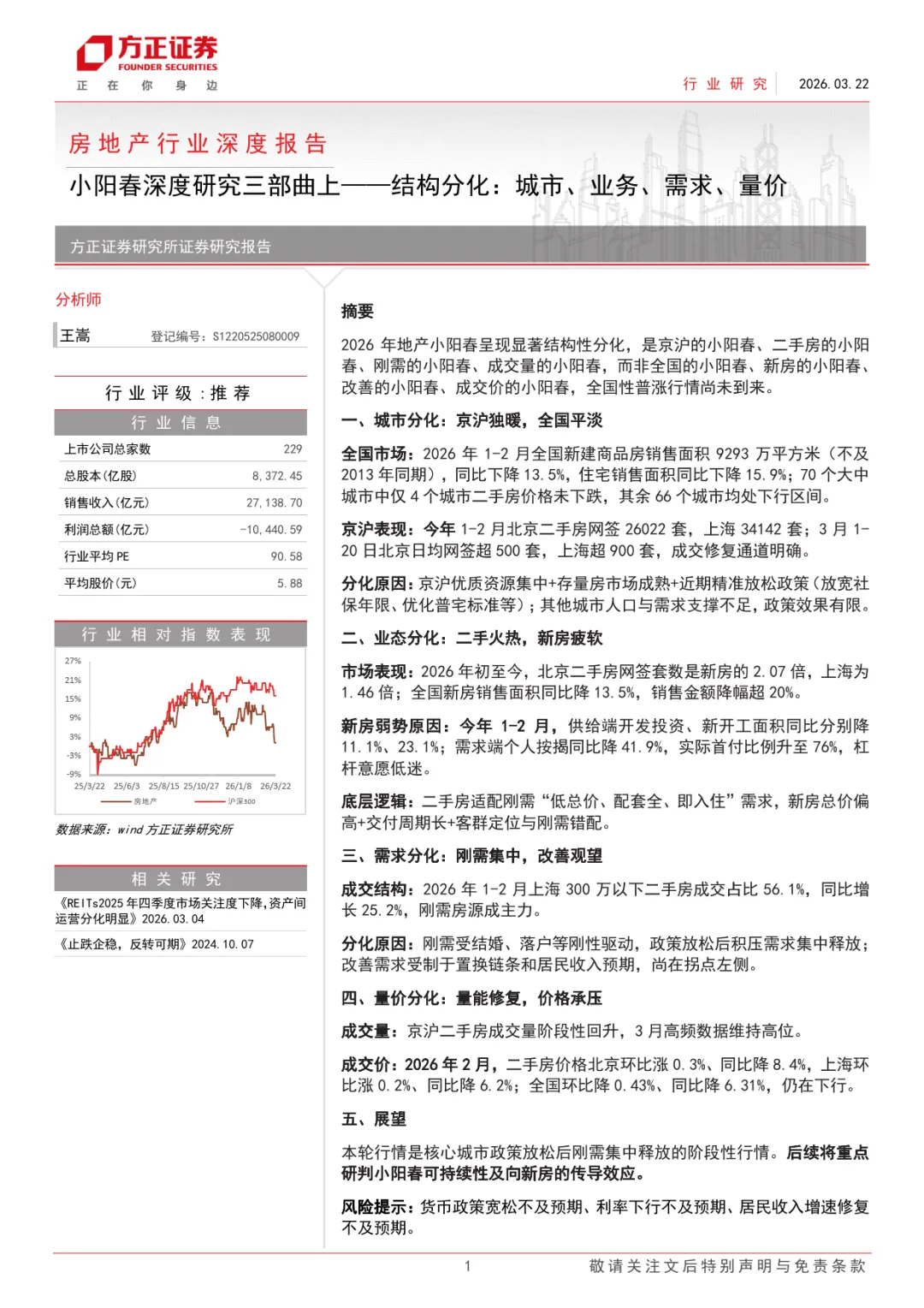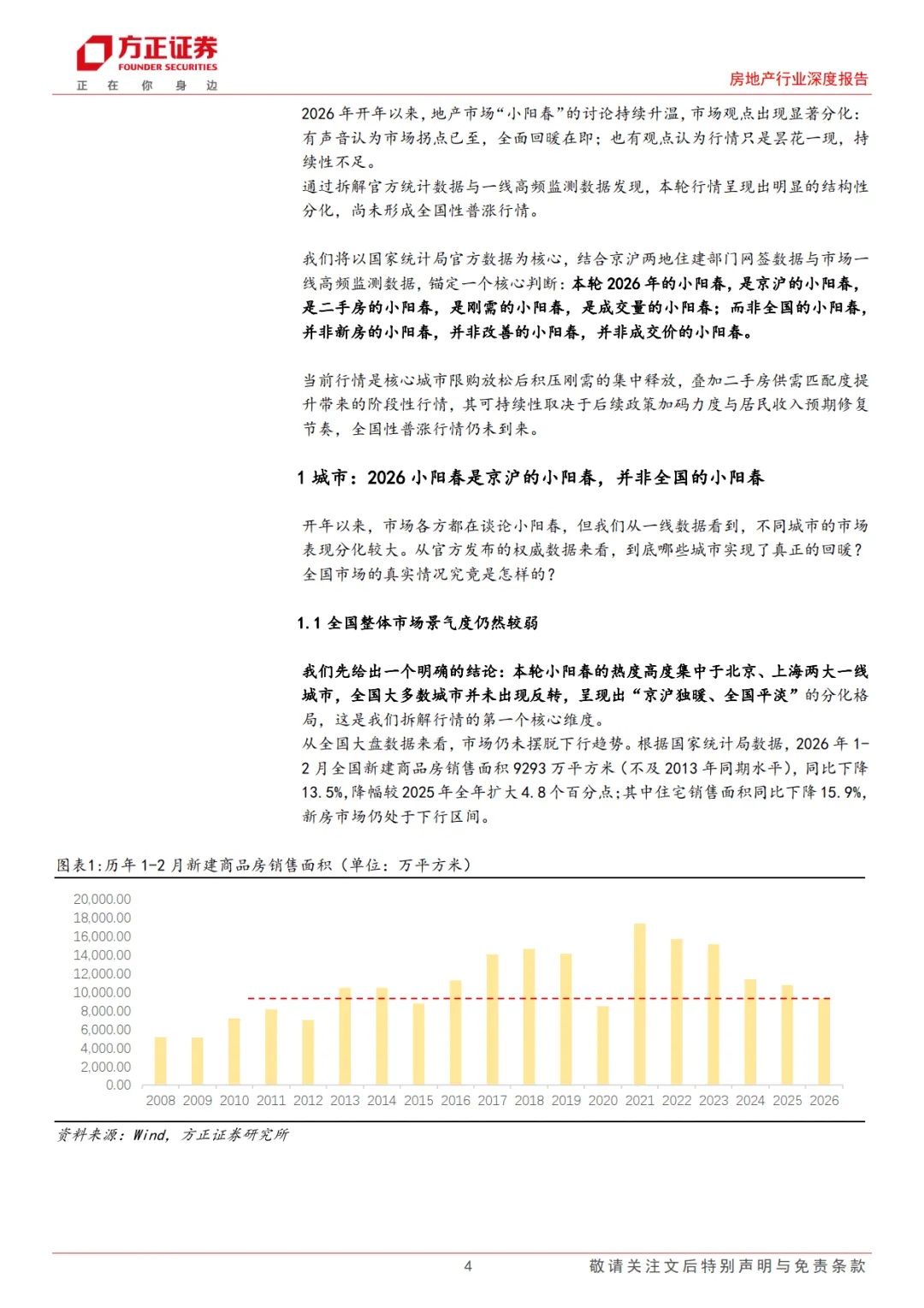 方正证券 2026 年 3 月发布的房地产行业报告指出,2026 年地产 “小阳春” 呈现极强结构性分化,并非全国普涨行情,而是京沪、二手房、刚需、成交量的局部回暖,全国新房、改善需求与成交价格仍处弱势。————