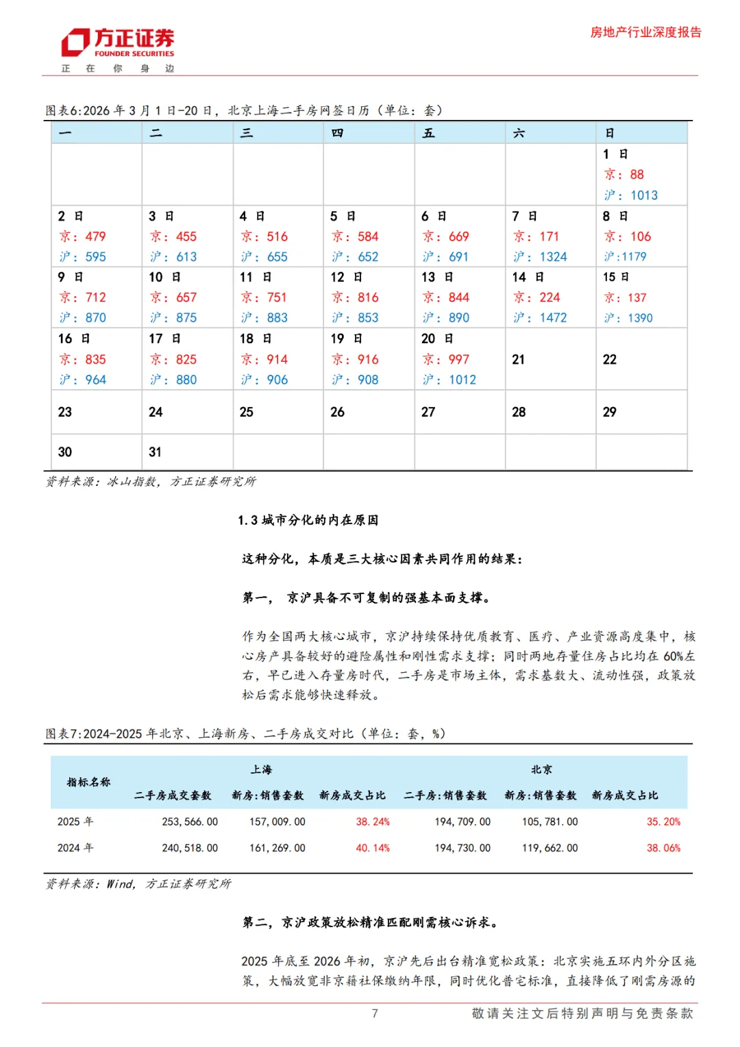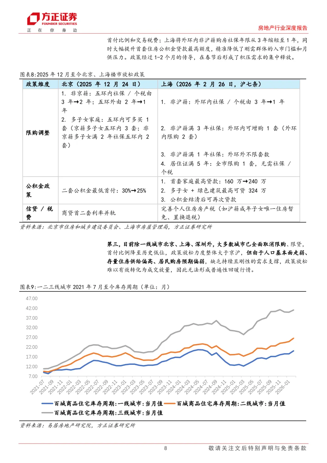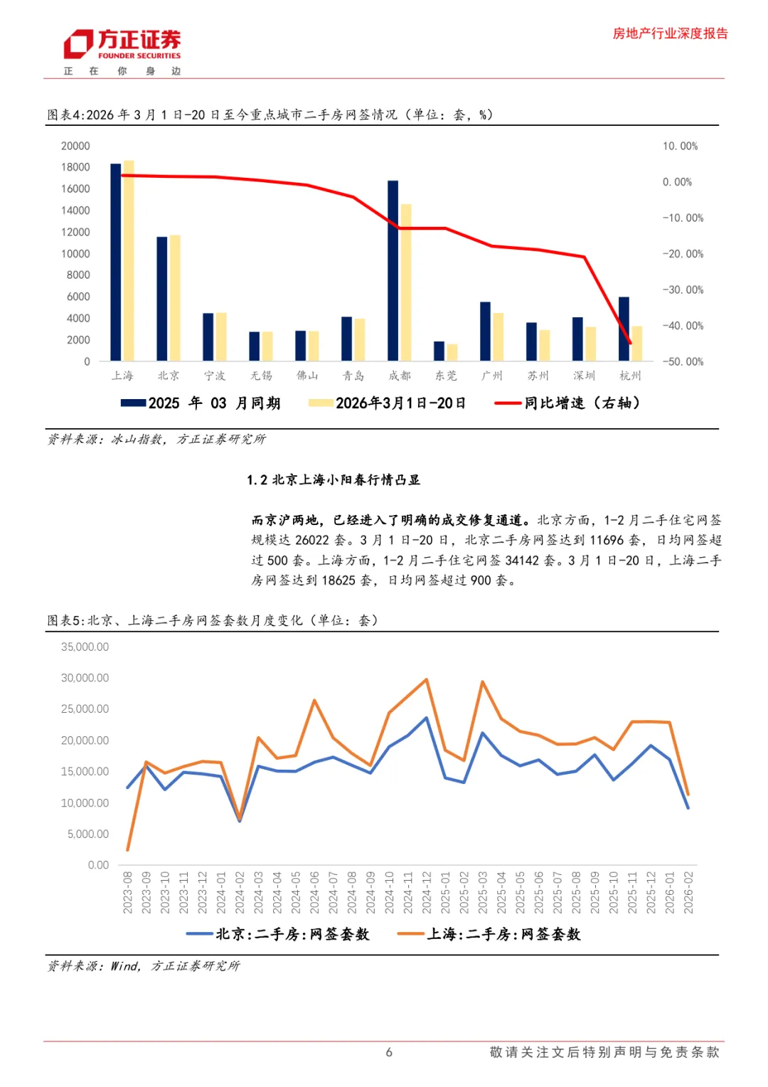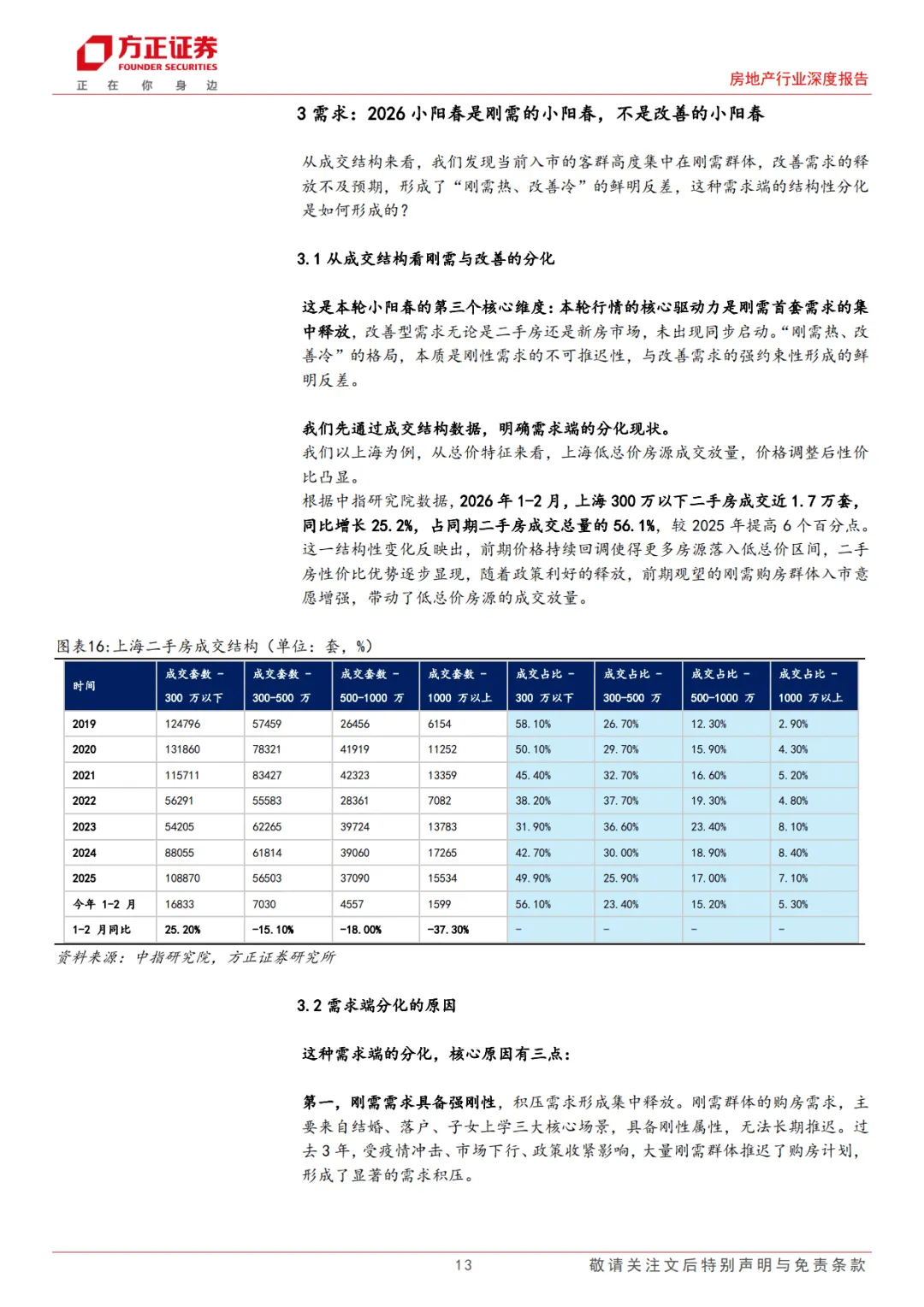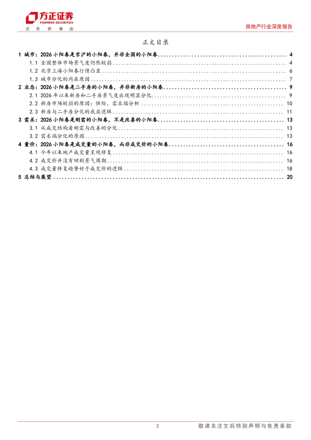 方正证券 2026 年 3 月发布的房地产行业报告指出,2026 年地产 “小阳春” 呈现极强结构性分化,并非全国普涨行情,而是京沪、二手房、刚需、成交量的局部回暖,全国新房、改善需求与成交价格仍处弱势。————