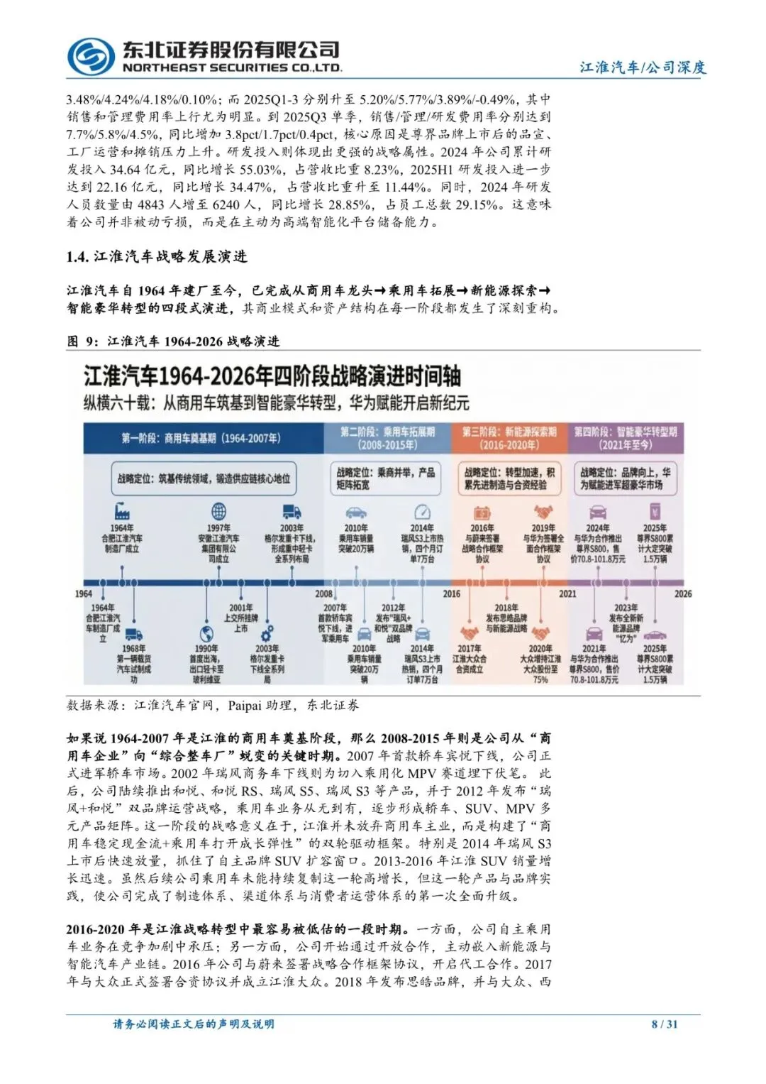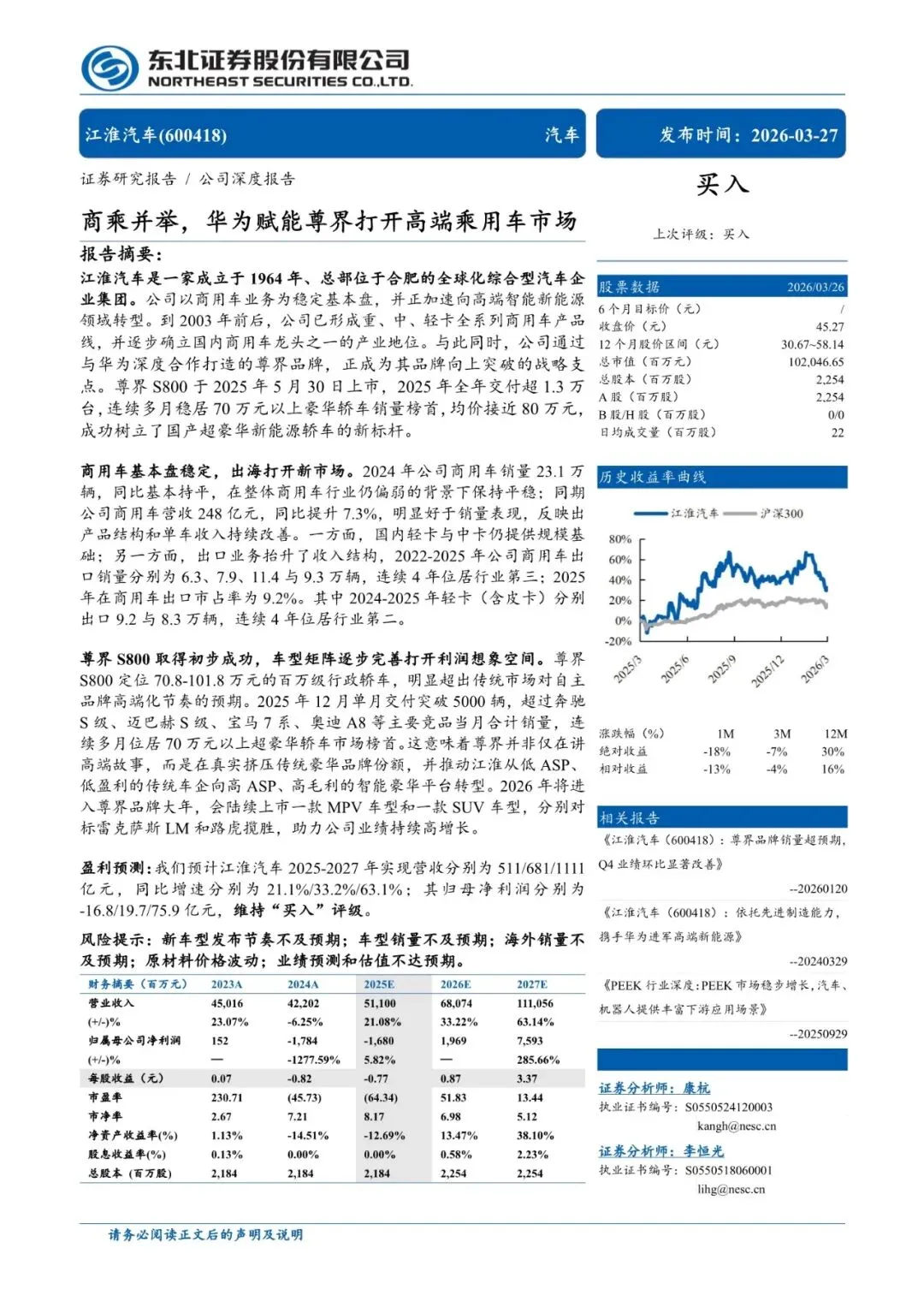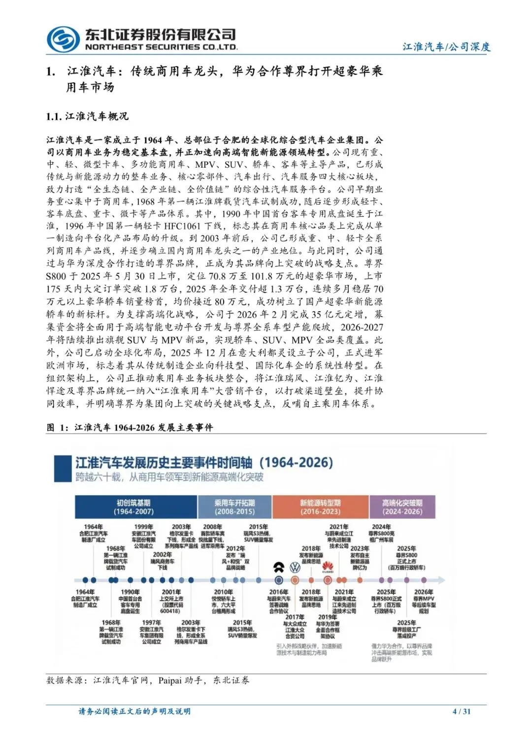 江淮汽车是一家成立于1964年、总部位于合肥的全球化综合型汽车企业集团。公司以商用车业务为稳定基本盘,并正加速向高端智能新能源领域转型。到2003年前后,公司已形成重、中、轻卡全系列商用车产品线,并逐步确立国内商用车龙头之一的产业地位。与此同时,公司通过与华为深度合作打造的尊界品牌,正成为其品牌向上突破的战略支点。尊界S800于2025年5月30日上市,2025年全年交付超1.3万台,连续多月稳居70万元以上豪华轿车销量榜首,均价接近80万元,成功树立了国产超豪华新能源轿车的新标杆。