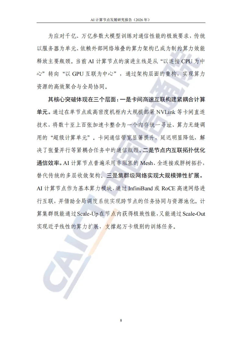 中国信通院2026年AI计算节点发展研究报告指出,全球AI产业加速发展推动智算需求激增,传统算力架构的性能、扩展与利用率瓶颈凸显,AI计算节点作为构建超大规模智算集群的核心,成为突破算力瓶颈的关键,我国正处于智能算力从规模化扩张向高效化提升的关键阶段。