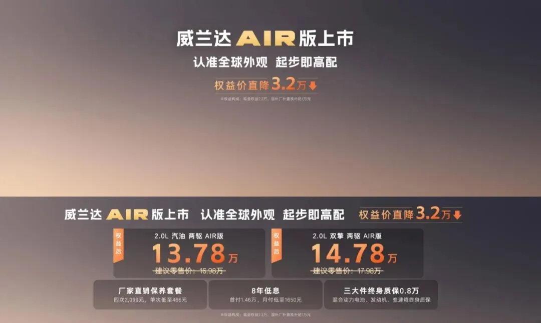 以不到14万的价格买到雅阁e:PHEV这样一台插混B级轿车足以给人不小震撼,但这只是国内汽车市场合资车内卷大战的开胃菜,广汽丰田便推出全新换代威兰达AIR版,2.0L汽油版权益价低至13.78万元,混动版仅需14.78万元。三年前,这一预算或许只能选择合资品牌的小型SUV,如今却能购入一台紧凑型SUV。尽管为控制成本,威兰达AIR版取消了8155芯片及部分舒适性配置,但仍保留了10安全气囊、TSS 4.0智驾系统及后双叉臂独立悬架,同时推出“三大件终身质保”这一在合资品牌中罕见的政策。