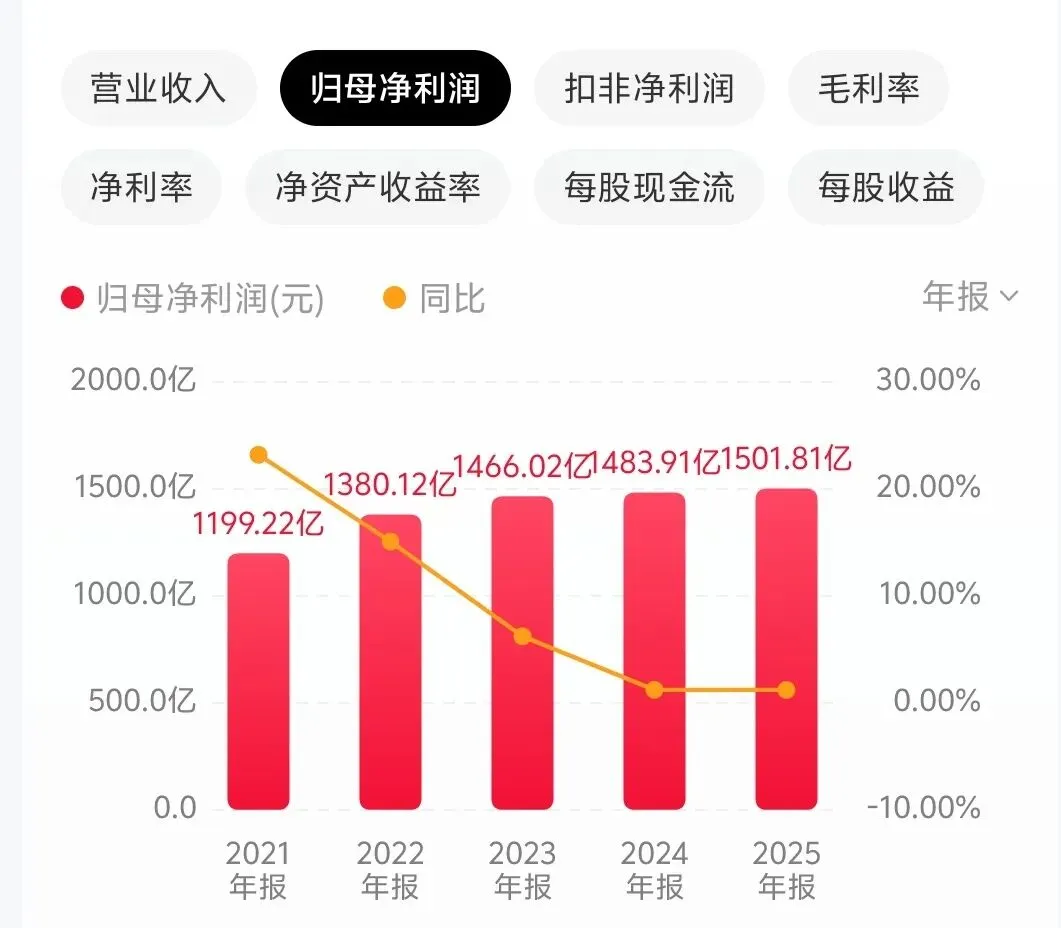 与营业收入相比,招商银行的归母净利润表现更为稳健。2021年归母净利润达到1199.22亿元,到2025年公司归母净利润达到1501.81亿元,同比增长1.21%,延续了稳健增长的态势,体现了其优秀的成本控制能力和风险抵补能力。