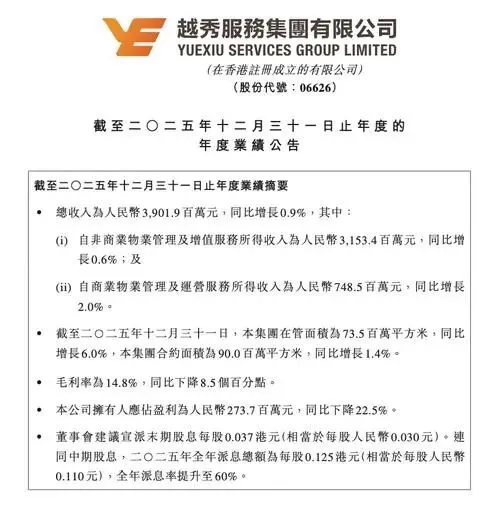 3月26日,越秀服务交出了2025年的年度答卷。在港股物业板块整体处于估值重塑的当下,这份成绩单呈现出一种复杂的底色:规模仍在扩张,但利润表却拉响了警报。