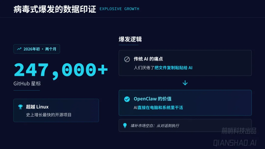 这份手册聚焦OpenClaw企业级智能体,阐释其作为AI范式第四次跃迁产物的核心价值与落地应用,核心是实现从AI“对话”到“执行”的突破,重构企业业务流。OpenClaw并非聊天机器人,而是开源、本地优先的AI代理网关运行时,作为大语言模型与数字环境的桥梁,凭借24.7万+GitHub星标成为增长最快的开源项目,填补了市场从对话到执行的空白,还吸引腾讯、字节跳动等大厂推出定制化方案,形成企业级生态。