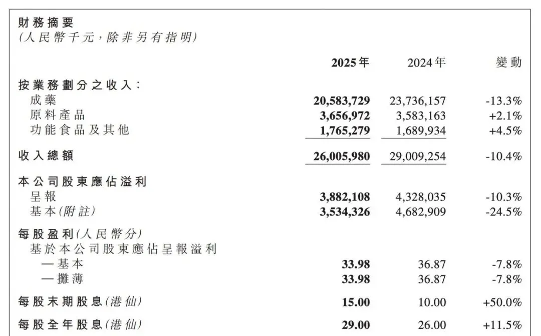 分业务来看,2025年,石药集团成药业务录得收入205.84亿元(包括授权费收入17.89亿元),较去年减少13.3%;原料产品业务录得销售收入36.57亿元,同比增加2.1%;功能食品及其他业务销售收入为17.65亿元,同比增加4.5%,主要是由于年内果维康销售收入的稳定增长。