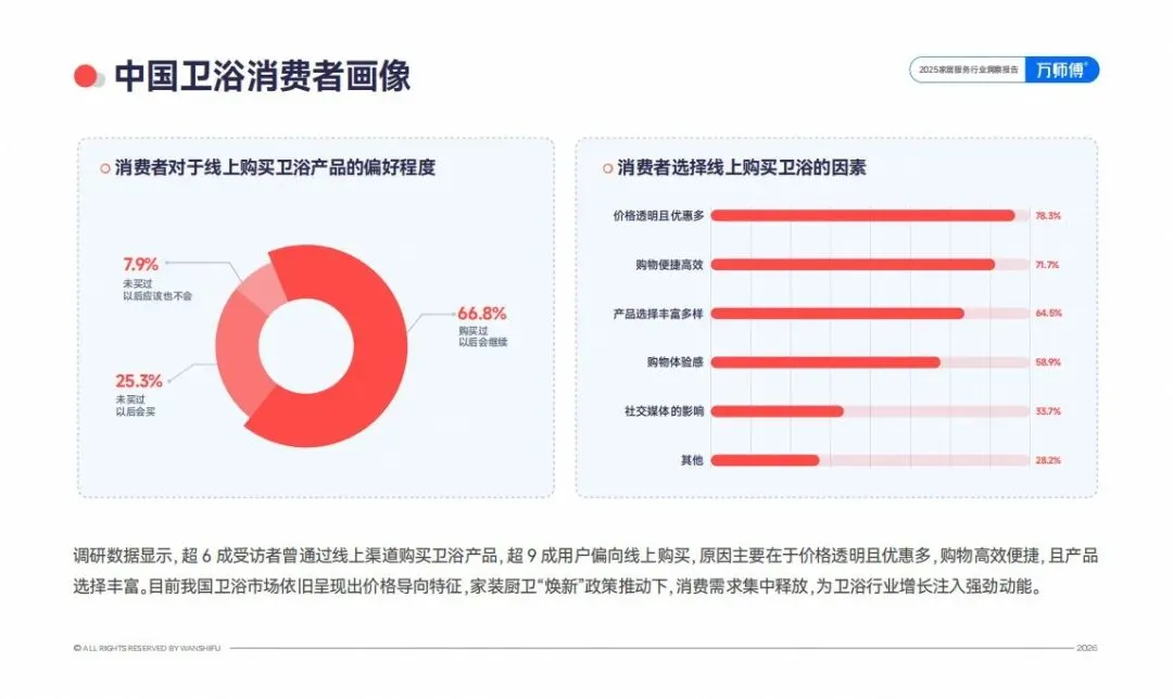超9成用户倾向线上消费,原因在于价格透明且优惠多,购物便捷高效,产品选择丰富。我国卫浴市场表现出明确的价格导向特征。