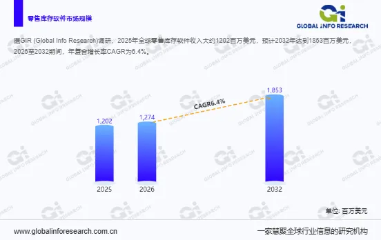 根据环洋市场咨询(Global Info Research)最新调研报告《2026年全球市场零售库存软件总体规模、主要企业、主要地区、产品和应用细分研究报告--环洋市场咨询(Global Info Research)》显示,2025年全球零售库存软件收入大约1202百万美元,预计2032年达到1853百万美元,2026至2032期间,年复合增长率CAGR为6.4%。