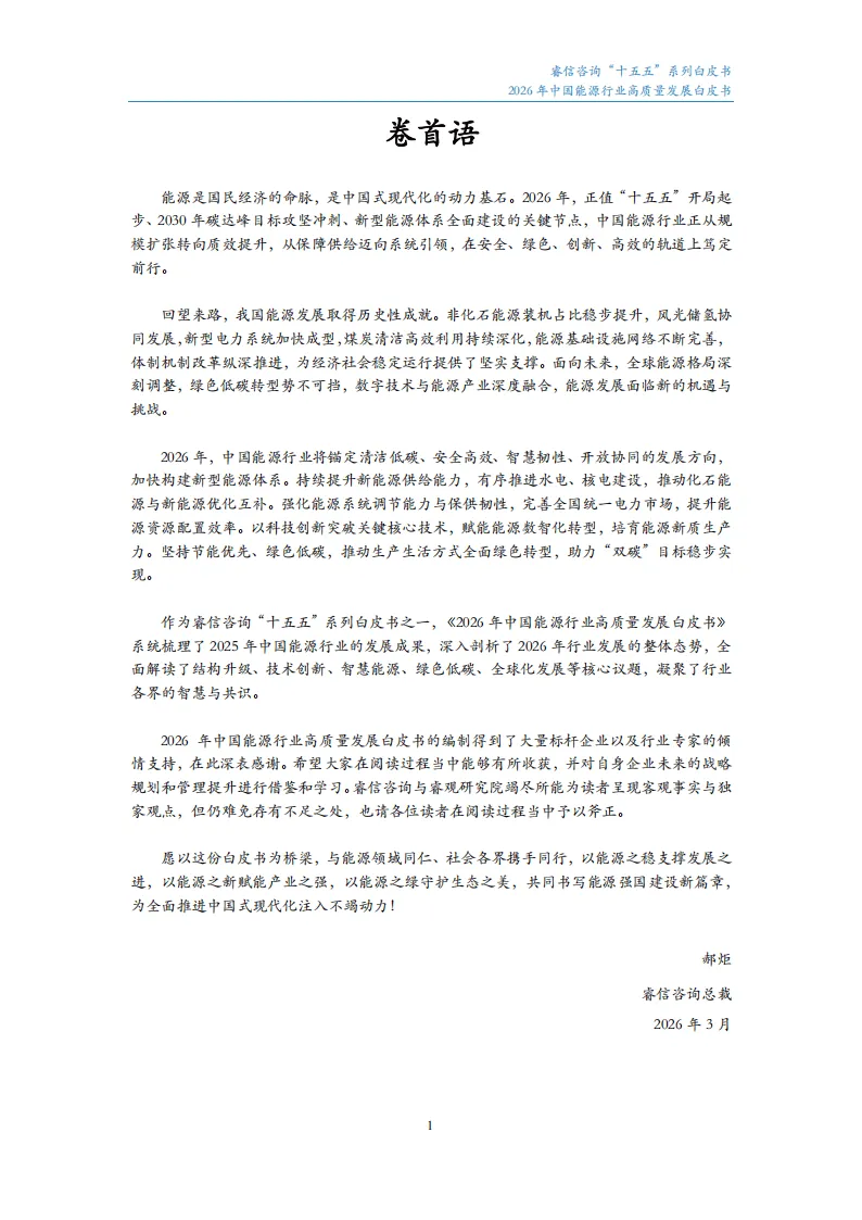 《2026年中国能源行业高质量发展白皮书》立足“十五五”开局关键节点,系统梳理2025年行业发展成果,剖析2026年发展态势,明确能源行业向质效提升、系统引领转型,以安全、绿色、创新、高效为方向构建新型能源体系的核心发展路径。