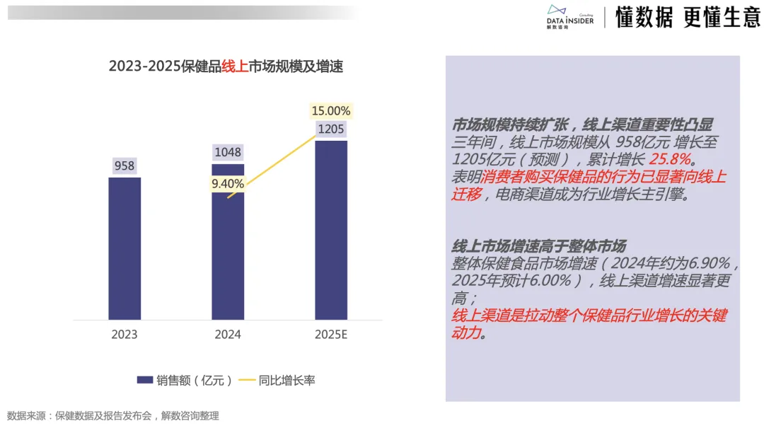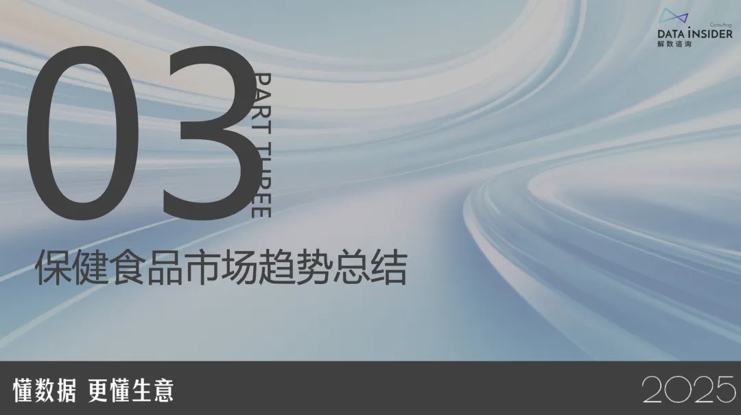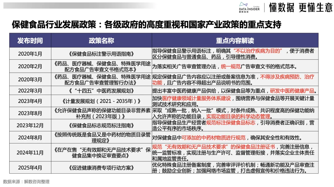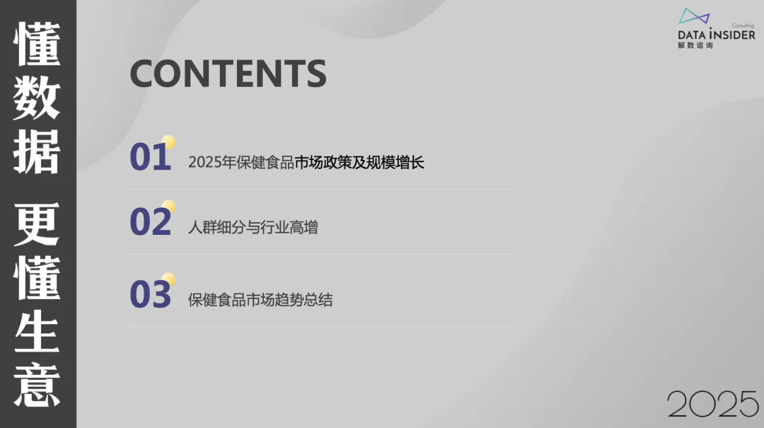 2025年保健食品行业正迎来从单一爆款打造到全生态布局的转型,在政策规范、消费升级与渠道变革的多重驱动下,市场呈现出稳健增长、细分深耕的全新格局。解数咨询《2025年保健食品趋势白皮书》为我们拆解了行业的核心发展逻辑,把握这些趋势,才能踩准行业新风口。