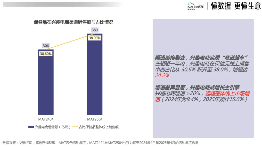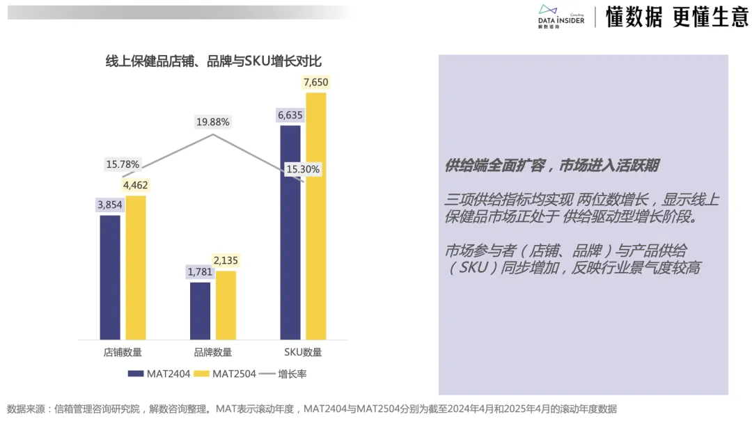 渠道端的变革更为显著,线上已成行业增长主引擎,2023-2025年线上市场规模预计从958亿元增至1205亿元,兴趣电商更是实现“弯道超车”,一年内线上销售占比从30.6%跃升至38%,成为新的增长核心。同时,线上店铺、品牌、SKU均实现两位数增长,供给端全面扩容,行业进入活跃期。