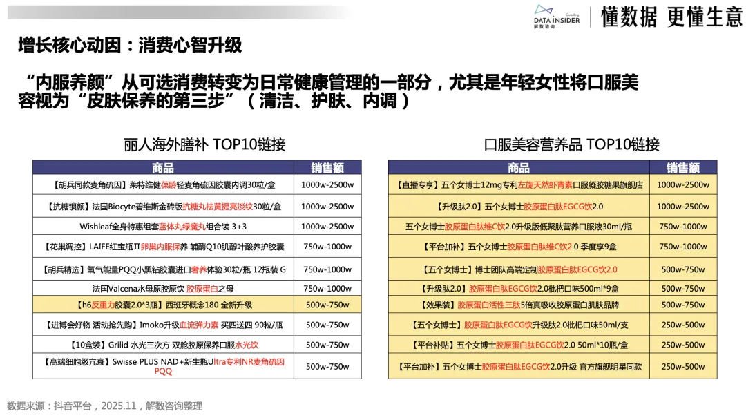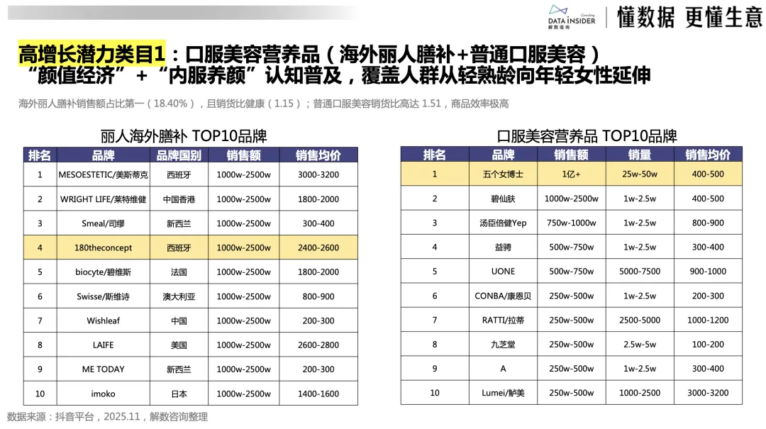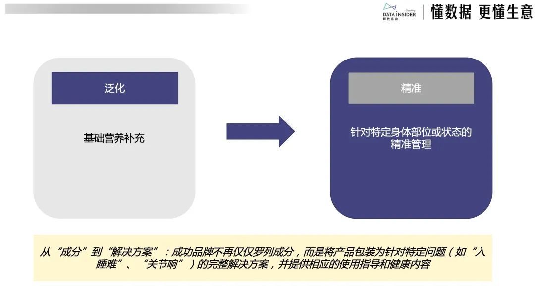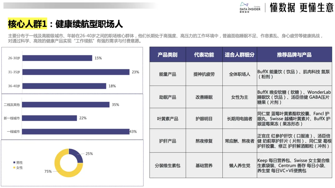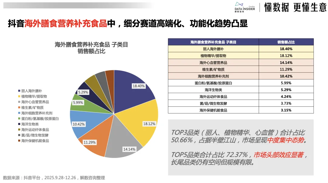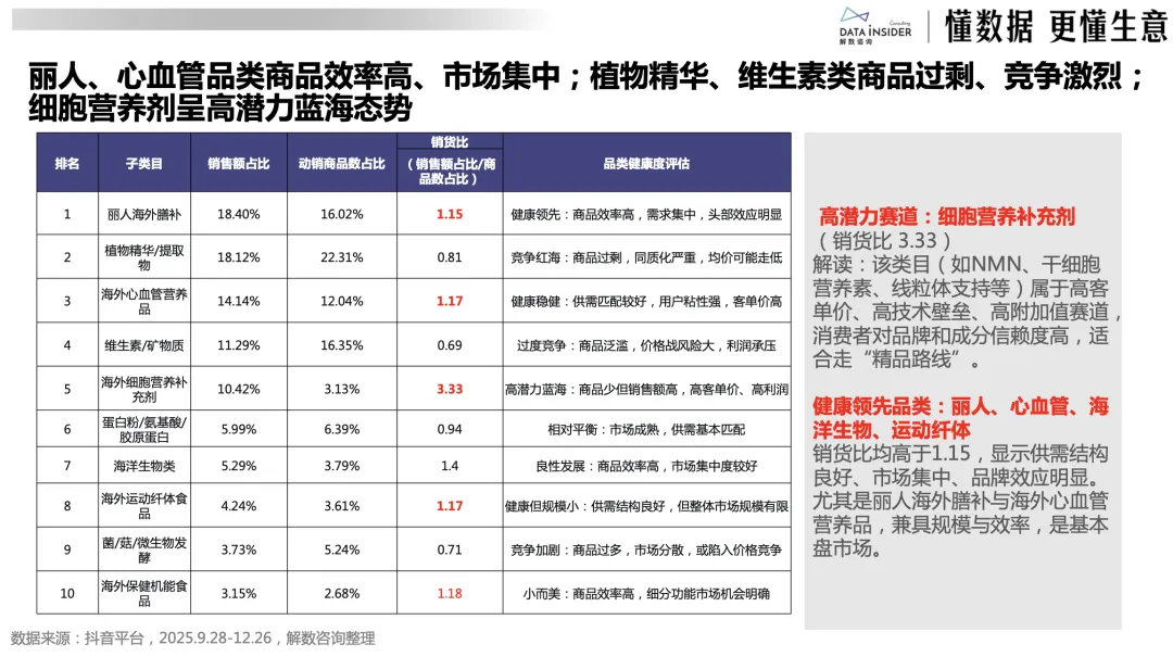 消费需求也从基础营养补充向**精准部位/状态管理**升级,品牌不再单纯罗列成分,而是打造“问题解决方案”,比如针对入睡难的助眠产品、针对熬夜的护肝产品,精准匹配消费痛点。海外膳补市场中,丽人、植物精华、心血管品类占据半壁江山,细胞营养补充剂更是凭借高客单价、高利润成为蓝海赛道。