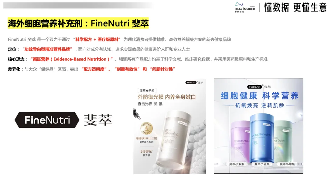 头部品牌的打法印证了这一趋势,五个女博士以科学营养为核心,靠超级单品占据口服美容赛道;FineNutri斐萃主打循证营养,以医疗级原料和精准配方切入细胞营养蓝海。未来,拥有独家专利、人体实验数据的品牌,将构建无法被复制的核心竞争力,而监管也将同步趋严,对功效宣传的规范成为行业必修课。