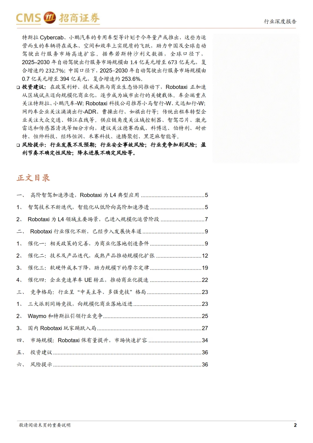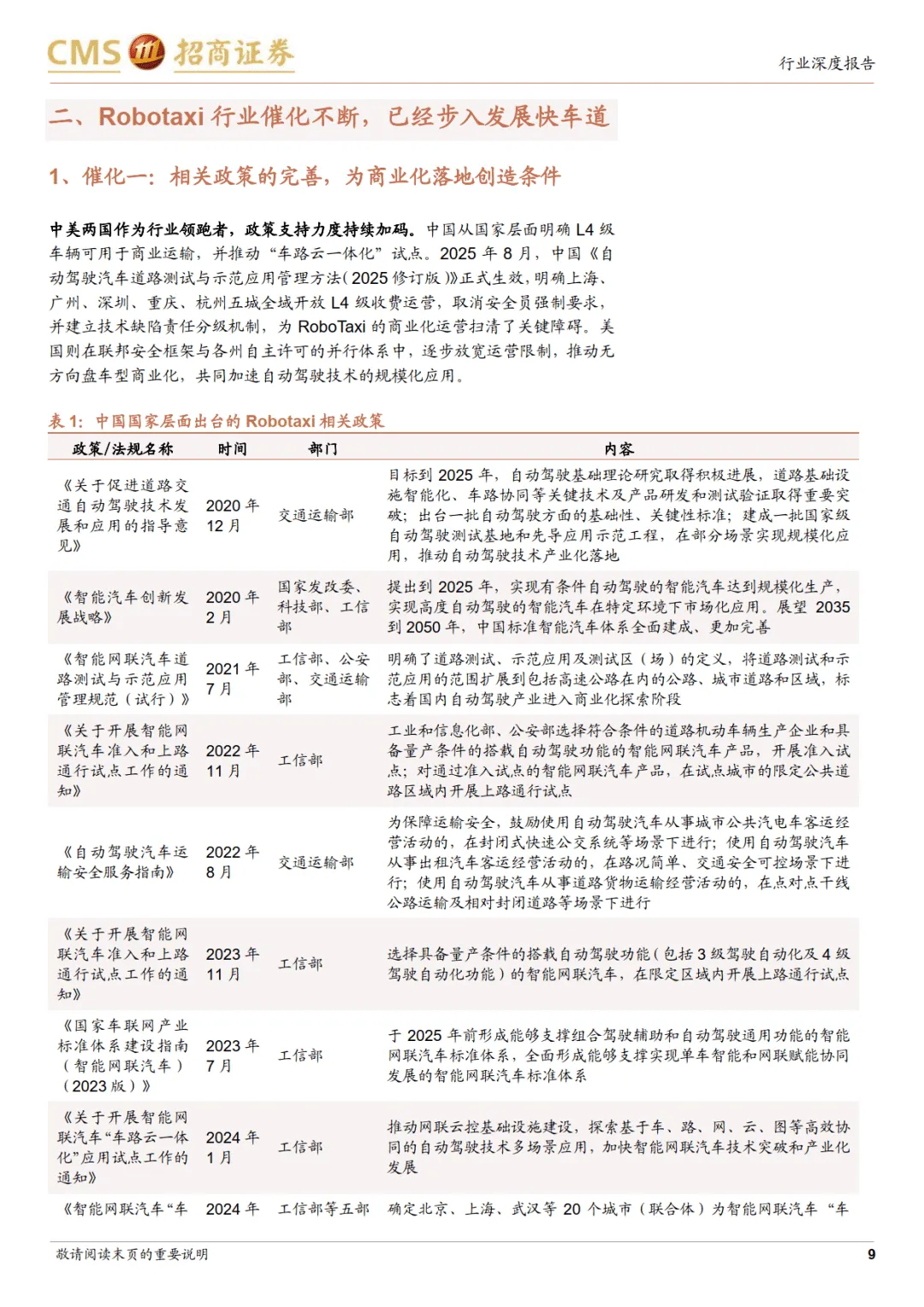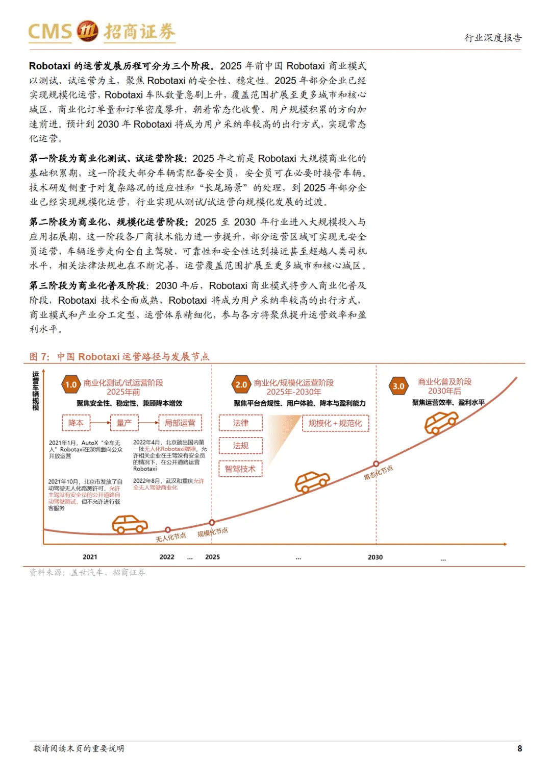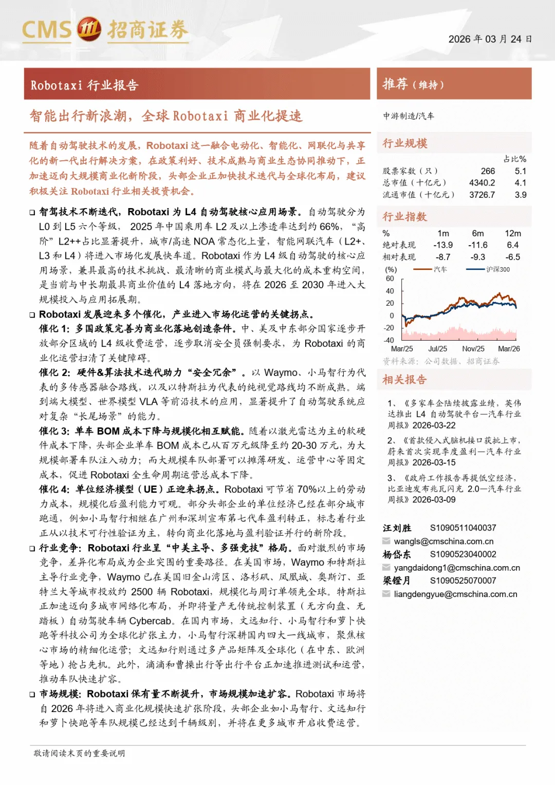 报告由招商证券于 2026 年 3 月发布,核心判断:Robotaxi 正从区域试点迈入规模化商业化拐点,2026-2030 年为行业高速扩张期,中美主导、多强竞技,中国市场增速与规模领跑全球。