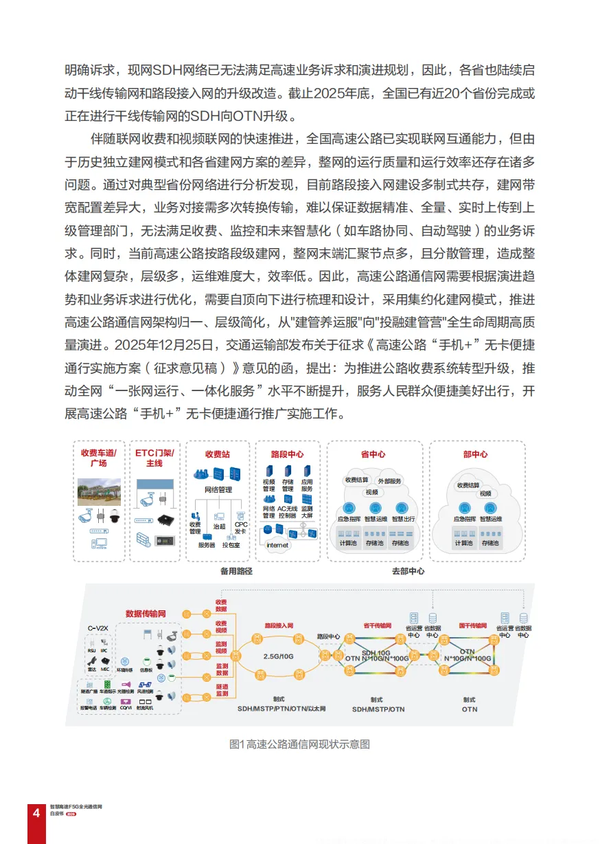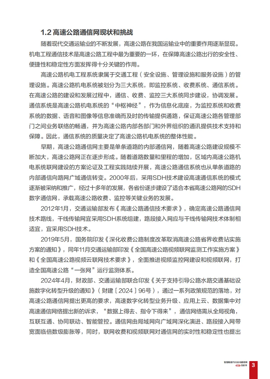 在智慧高速信息化建设深入推进的行业大背景下,高速公路通信网作为高速公路信息化底座,为高速公路收费、感知等业务提供信息化通路,为高速公路生产运营提供基础支撑,因此高速公路行业对高速公路通信网的建设,从性能、带宽和运维等方面都提出了更高的要求。
