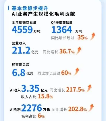 据了解,公司基于每年过亿条对话数据和百万条结构化订单数据,自主研发了12个覆盖交易、销售、履约及内部协同的全流程AI数字员工。公司自研SaleMatch交易引擎日均处理超1600万条消息,解析准确率95%以上,并完成数亿级的智能交易匹配。借助AI Agent,平台交易品类也从钢铁拓展至电子元器件、工业电气和型管类产品。