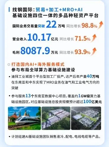 这意味着找钢国际的商业模式已从单一钢铁贸易,升级为“贸易+加工+MRO+AI基础设施”四位一体的多品种轻资产平台。