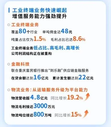 增值服务能力持续增强,物流营收超4.8亿元,同比增长19.2%,毛利接近3000万元,物流吨位接近800万吨,同比增长15%,金融科技业务通过参股形式恢复,到乐融项目在贷余额达16亿元,累计发生额达到22亿元。