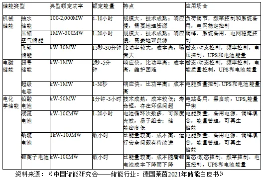 储能即能量的存储,指通过某种介质或设备,将一种形式的能量转化成另一种较为稳定的能量形式并存储,在需要时以特定能量形式释放出来的一系列技术和措施。根据储能原理的不同,可以细分为机械储能、电磁储能和电化学储能等。各储能类型的功率范围、特点及应用场景如下所示: