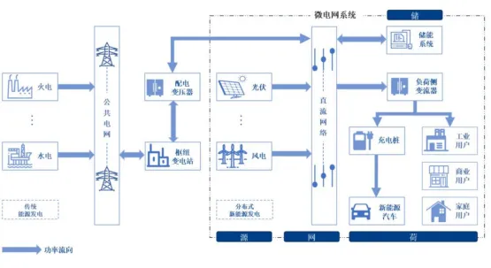 伴随新能源应用场景的多元化,用户逐步萌生了构建局部微电网的需求,即将“电源”(光)、“储能”(储)和“负荷”(充)连接起来,通过配套的调控技术、通信技术以实现对各类分布式能源整合调控,构建小型微电网,实现新能源本地的自发自用,并与大电网双向连接,减少对大电网的冲击,甚至在某种程度上可以支撑大电网的平衡。该小型微电网系统与储能构成了“光储充综合能源系统”,是“源网荷储”较为重要的应用方向。