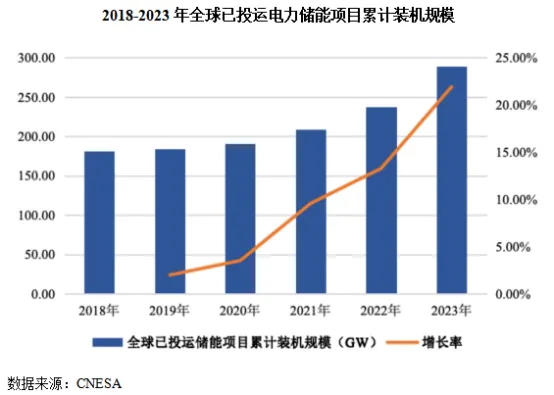 根据CNESA的相关报告,截至2023年末,全球已投运储能项目累计装机功率达到289.20GW,较2022年末237.20GW同比增长约21.92%。新型储能的累计装机规模高达91.33GW,同比增长99.62%。