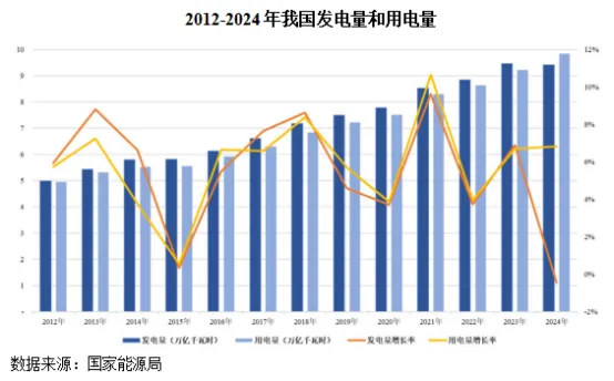 随着我国国民经济的持续发展,我国发电量和用电量均保持平稳增长。2012-2024年,我国发电量由49,875.53亿千瓦时增长至94,180.60亿千瓦时,年均复合增长率为5.44%;全国用电量由49,591.00亿千瓦时增长至98,521.00亿千瓦时,年均复合增长率为5.89%。根据中电联预测,2025年我国全社会用电量预计为9.5万亿千瓦时,2030年预计为11.3万亿千瓦时,“十四五”、“十五五”期间,我国全社会用电量年均增速分别为4.8%、3.6%。