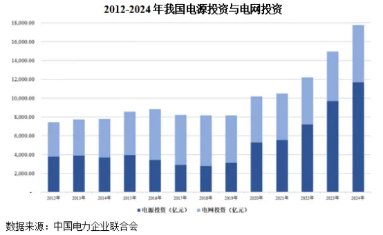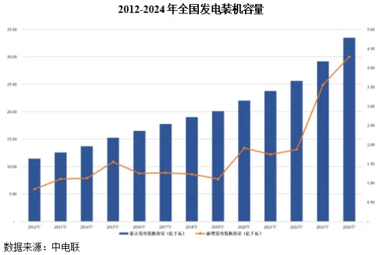 发电环节是电网的源头,近年来我国发电装机容量稳步增长,2012-2024年末,我国累计发电装机容量由11.47亿千瓦增长至33.49亿千瓦。发电装机容量指电力系统实际安装的发电机组额定有效功率的总和,发电装机容量的增长将有效带动电力配套设备的增长。