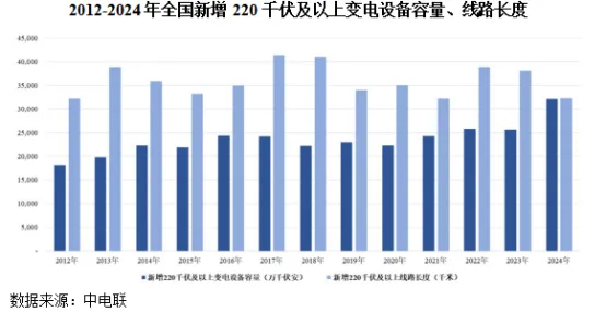 2012-2024年,每年新增220千伏及以上变电设备容量平均在20,000万千伏安以上,220千伏及以上输电线路长度均在30,000千米以上。其中,220kV及以上新增变电设备容量影响变电侧电力监测设备市场容量;220kV及以上输电线路增量影响输电侧电力监测设备市场容量;前述对市场容量的影响,一部分来自新建变电站或输电线路带来的新增需求,另一部分来自累积存量带来的更新改造需求。