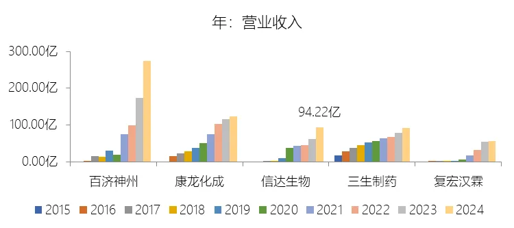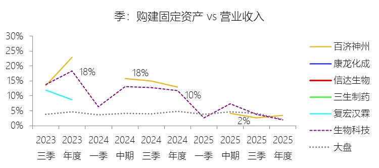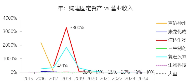 购建固定资产:2025年,信达生物的购建固定资产缺数据,与营业收入的比例无效;2015-2024年(十年),此项合计为53.65元,平均比例为18.26%,比生物科技行业的均值低1.47个百分点,长期呈下降趋势。